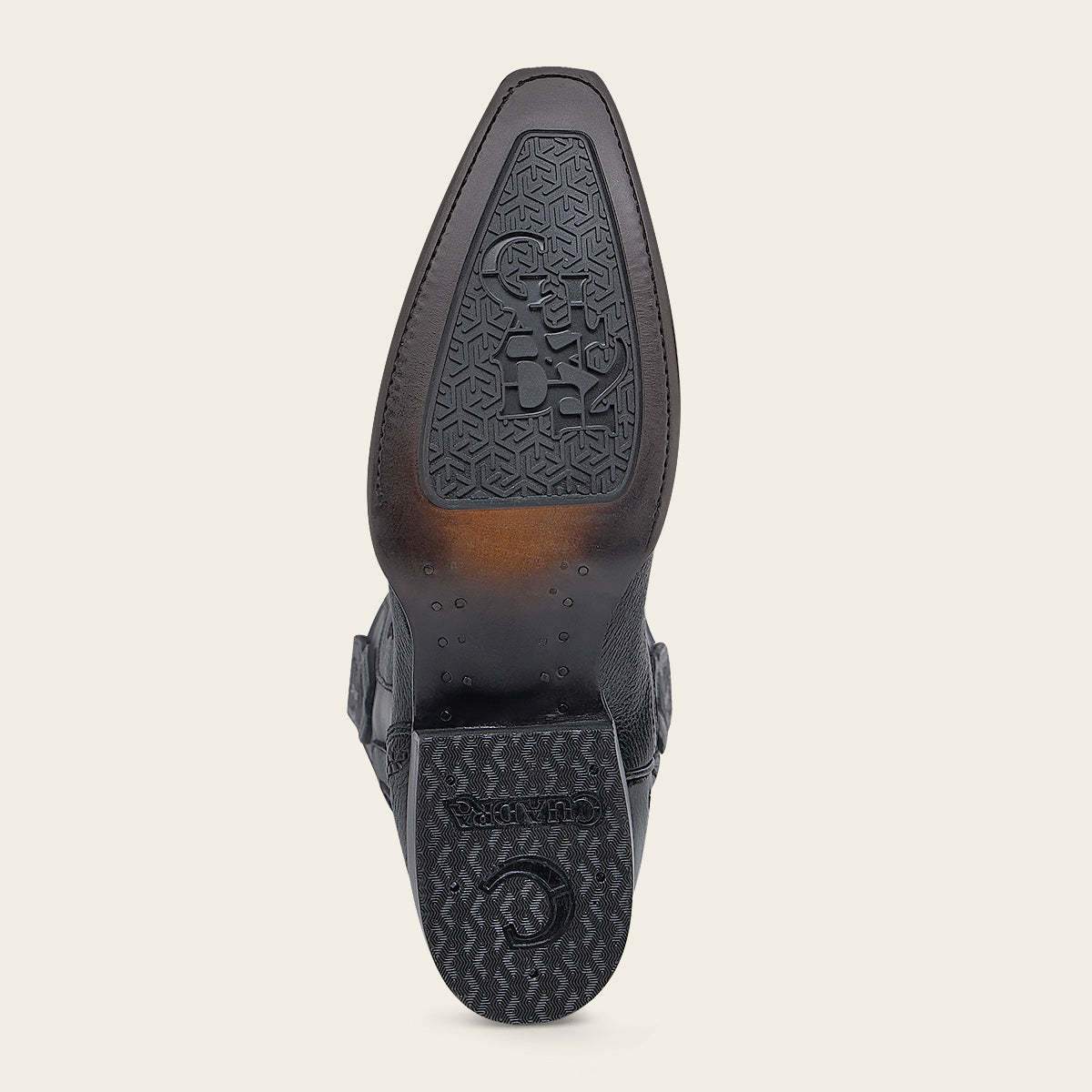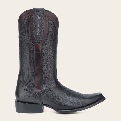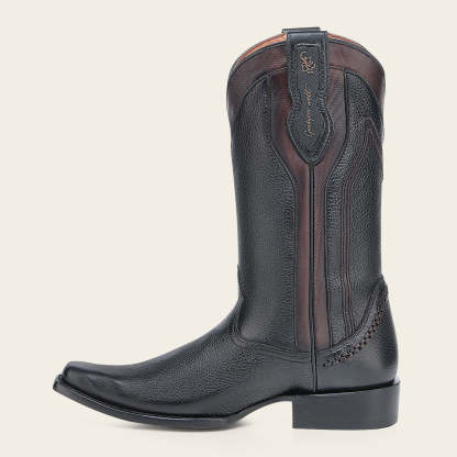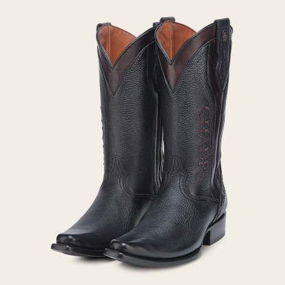 Bota vaquera para caballero en piel genuina de venado y piel de bovino. Sobre el tubo presenta logotipo de KPU microinyectado en alto relieve, tejido, grabado láser y aplicaciones de PVC. Con orejas en los costados con aplicación de PVC de logo “ Goodyear Welt”. Cuenta con las nuevas tecnologías: planta Ortholite, plantilla flex removible y tubo con entretelas suaves. Con suela de cuero con injerto de TPU antiderrapante.