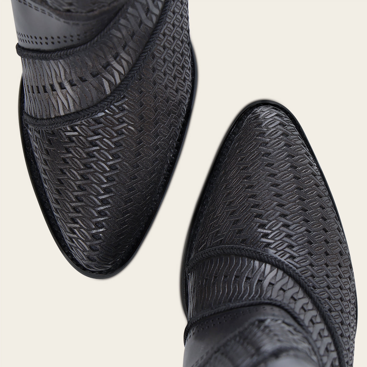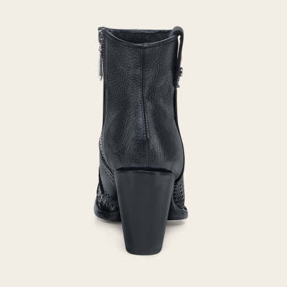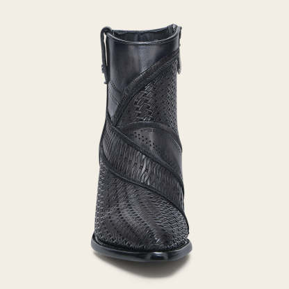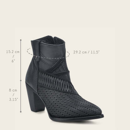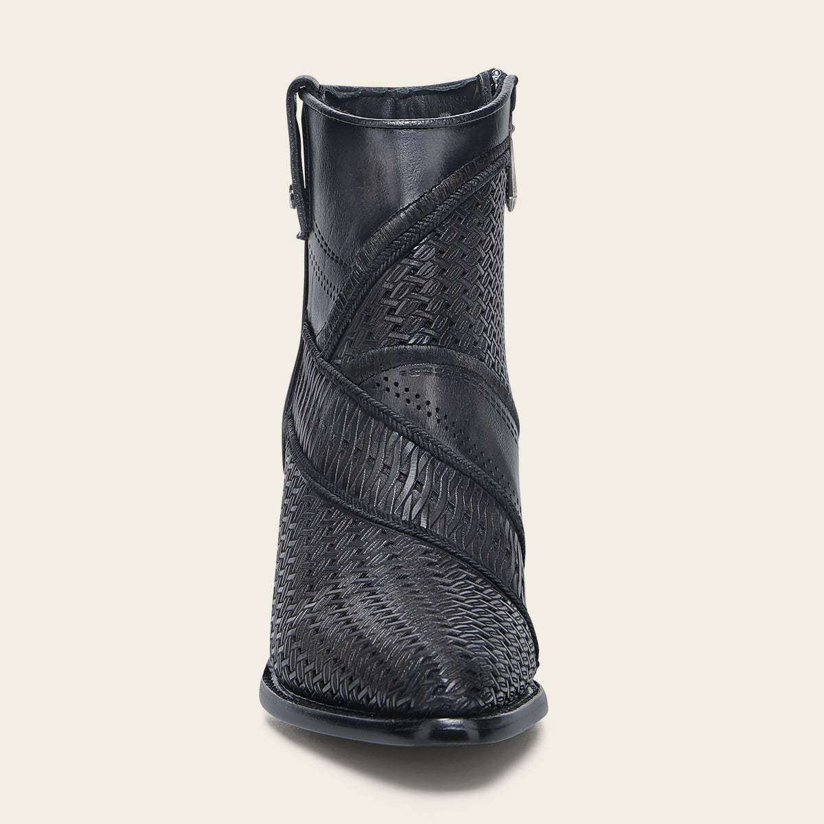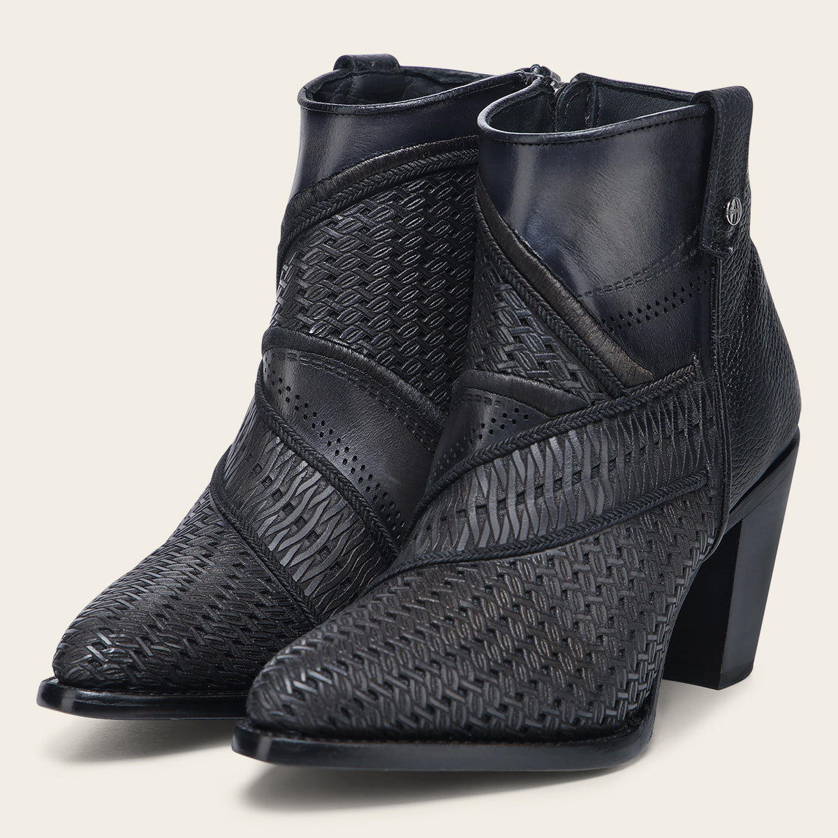 Botín para dama en piel genuina de bovino. Presenta bordado en alto relieve, detalles de trenzado artesanal, grabado láser, perforaciones y oreja en el lado exterior con aplicación metálica del logo Cuadra. Con acabado pintado a mano. Ajustado con cierre interno. Cuenta con las nuevas tecnologías: planta Ortholite, plantilla flex removible, horma mejorada para brindar un mayor confort y tubo con entretelas suaves. Con suela con injerto de TPU