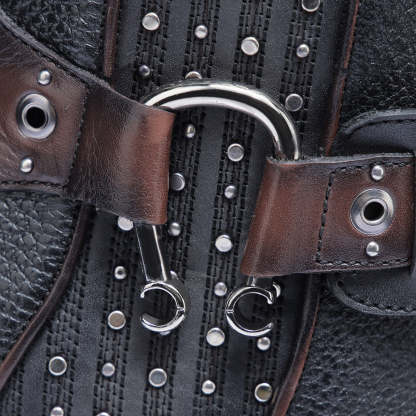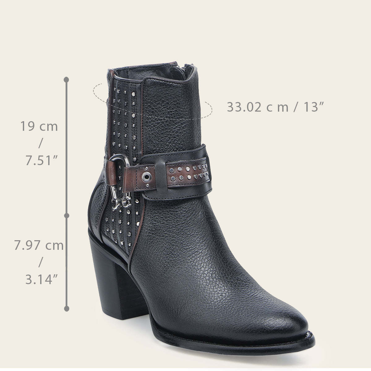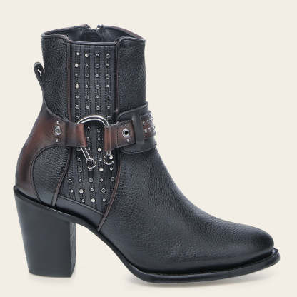 Botín biker para dama en piel genuina de bovino. Presenta correa decorativa alrededor del tobillo con herrajes y aplicación metálica en forma de herradura. En el costado presenta aplicación de estoperoles. Ajustada con cierre interno y aplicación elástica forrada en piel para mejor ajuste. Cuenta con las nuevas tecnologías: tubo con entretelas suaves, planta Ortholite y plantilla flex removible.