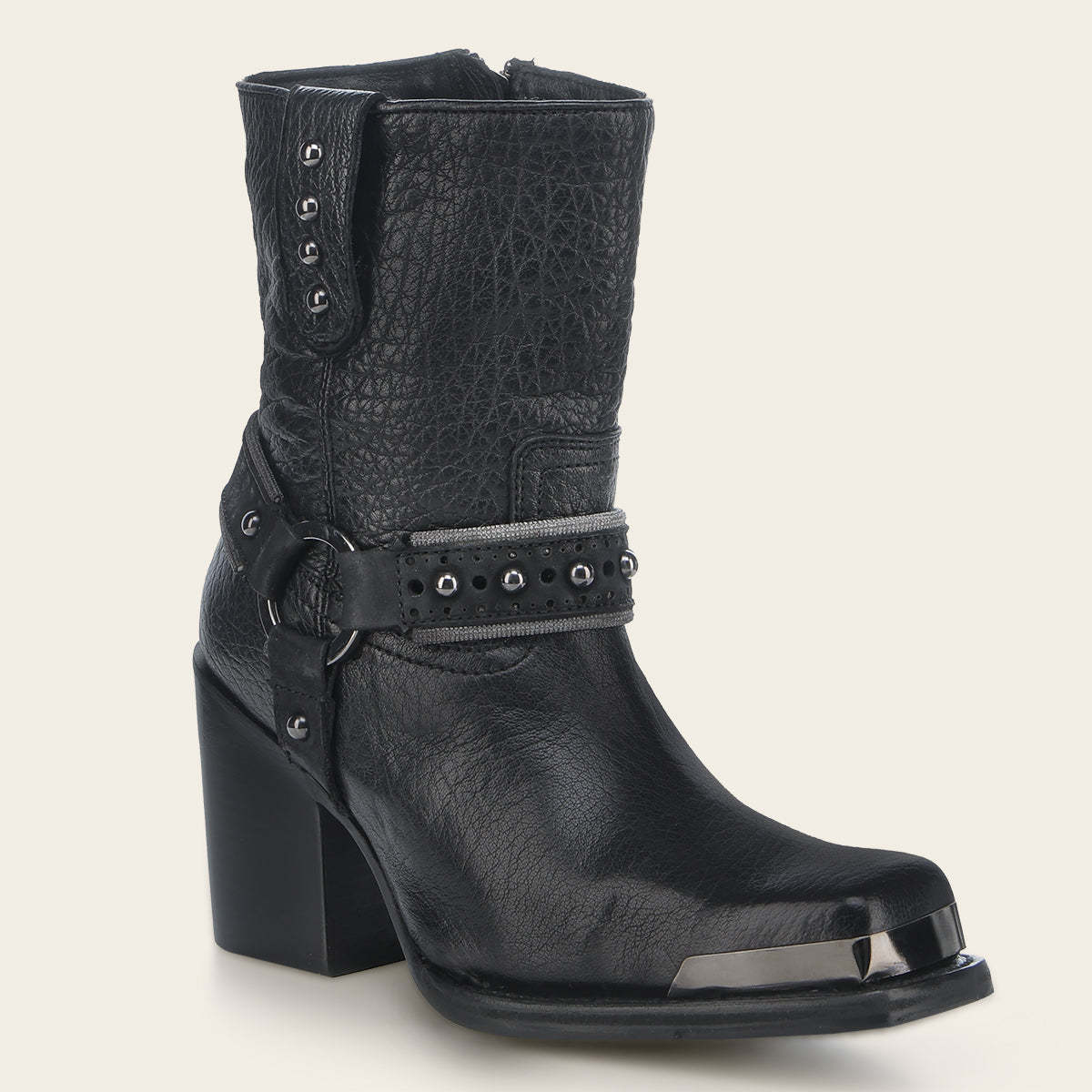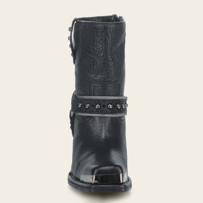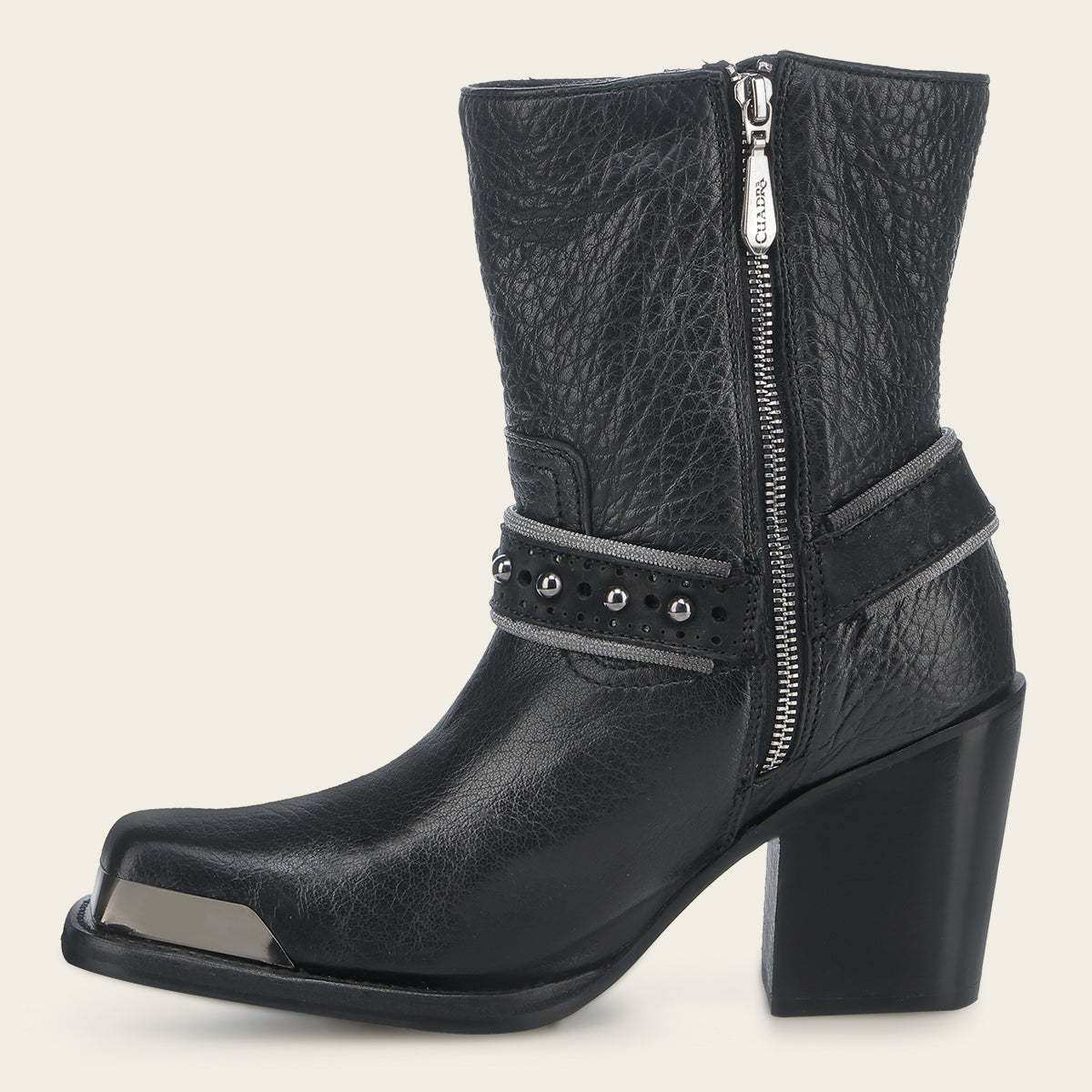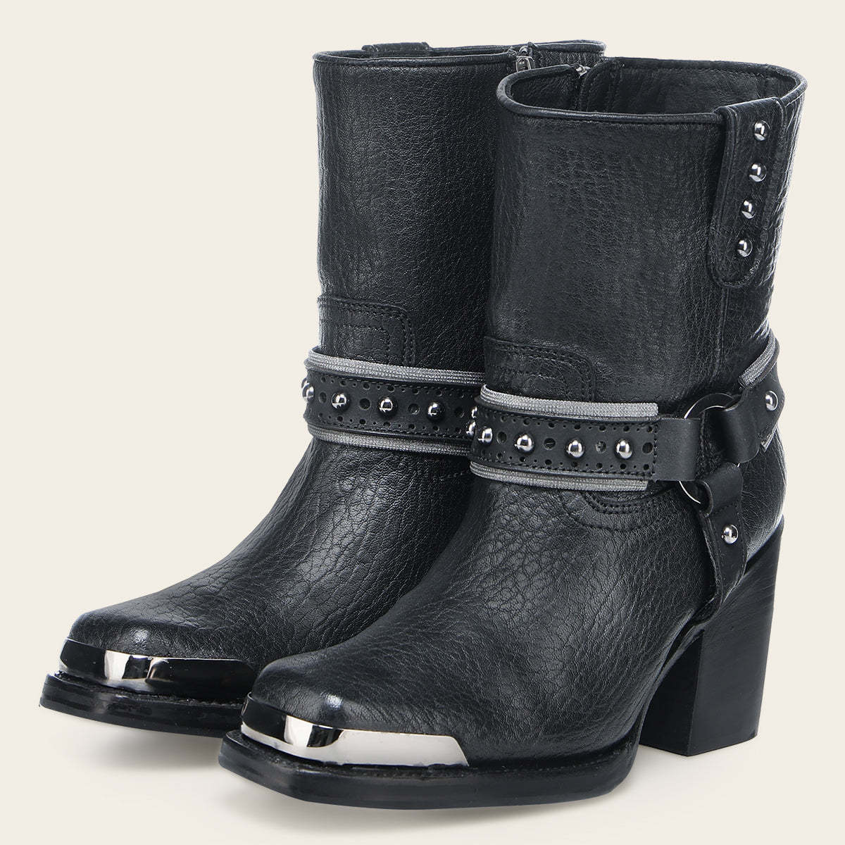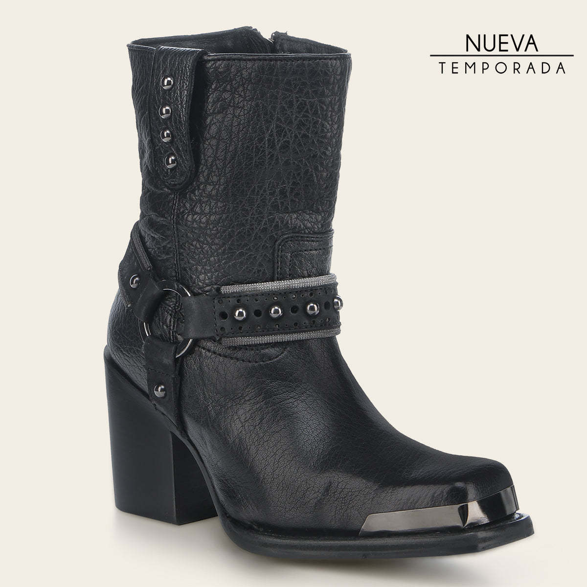 Botín biker para dama en piel genuina de bovino. Presenta correa decorativa alrededor del tobillo con herrajes y aplicación metálica en forma de herradura. En el costado presenta aplicación de estoperoles. Ajustada con cierre interno y aplicación elástica forrada en piel para mejor ajuste. Cuenta con las nuevas tecnologías: tubo con entretelas suaves, planta Ortholite y plantilla flex removible.