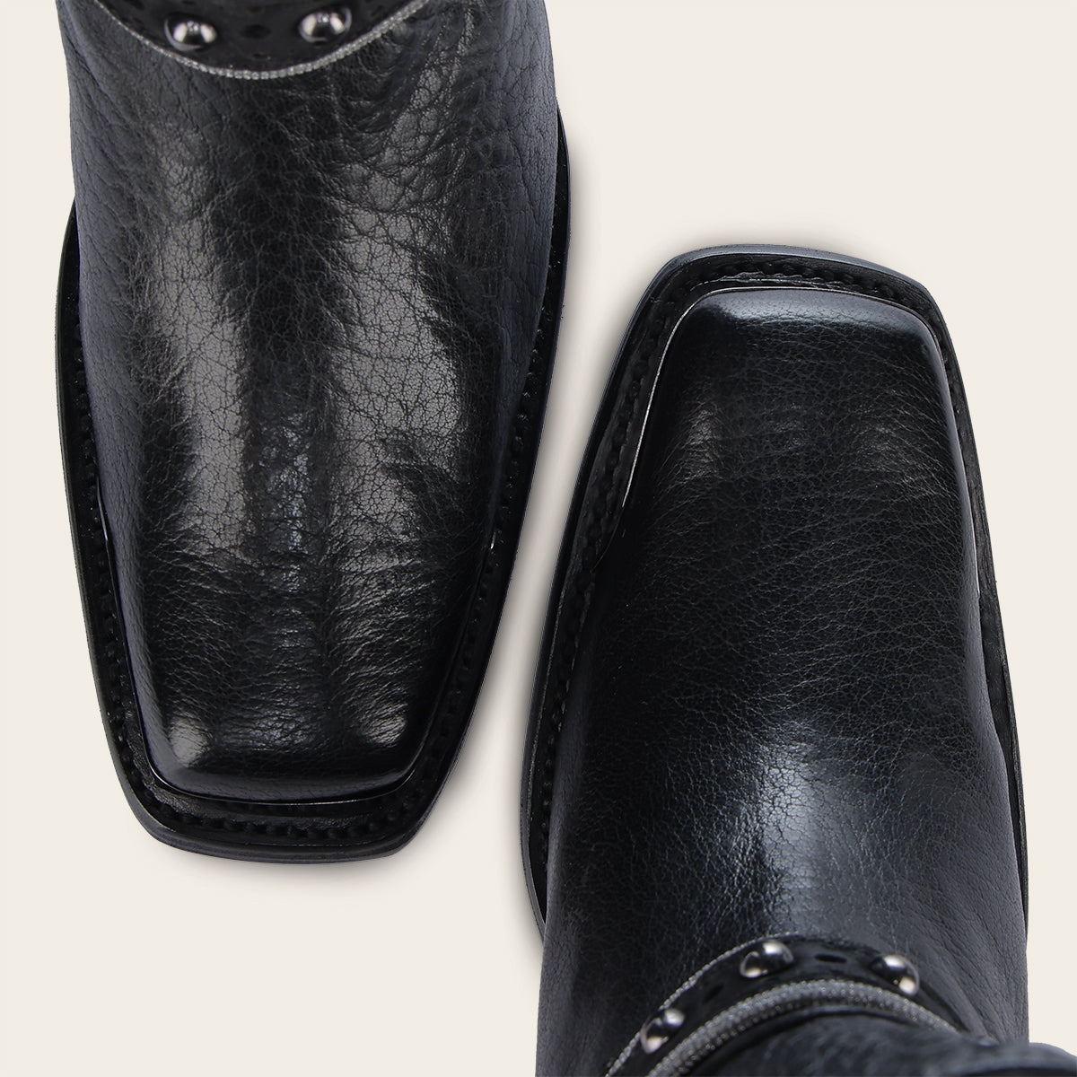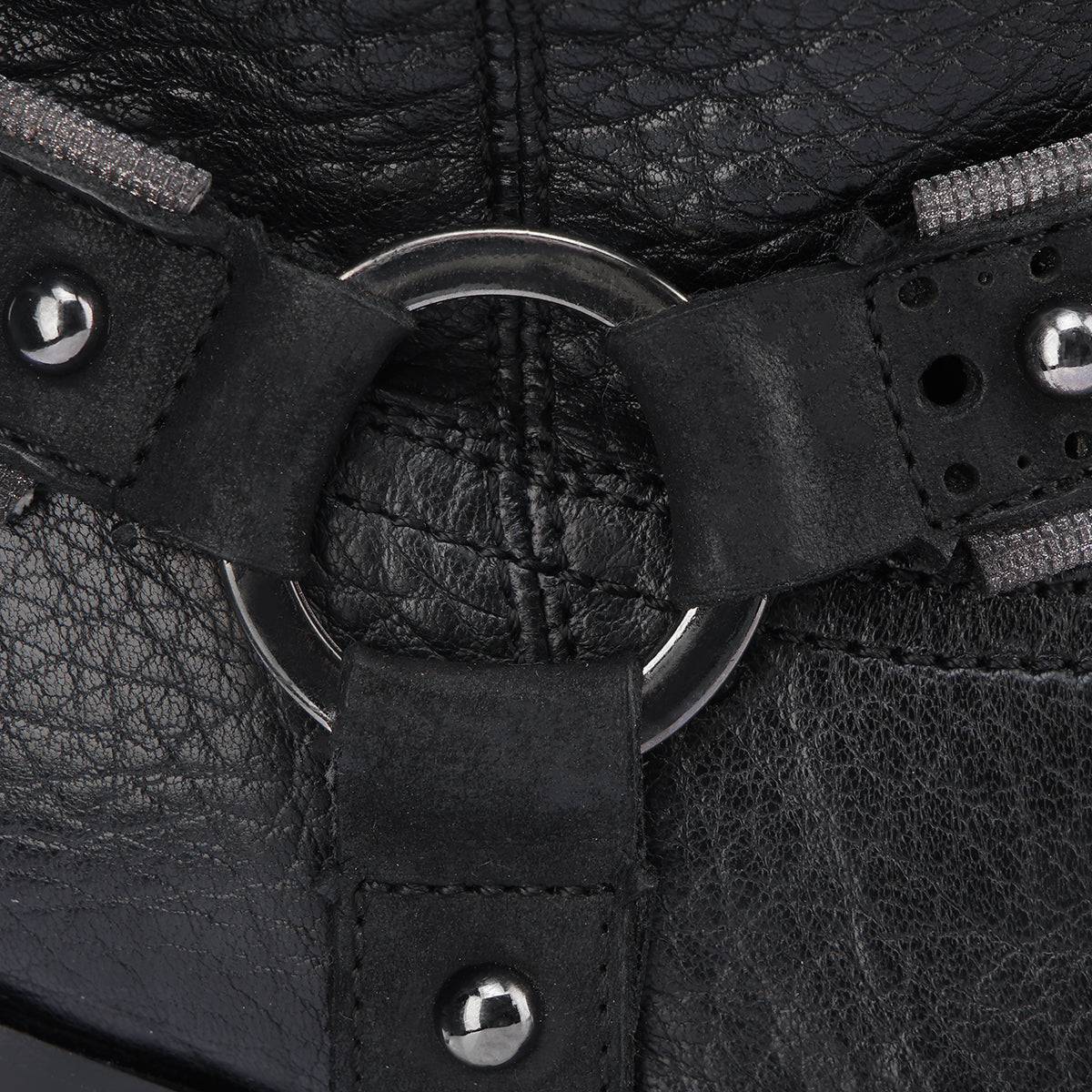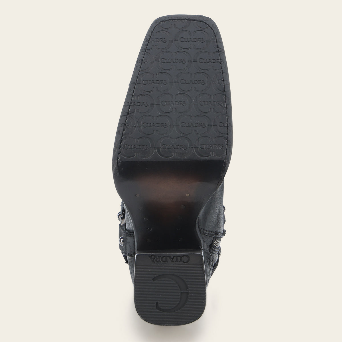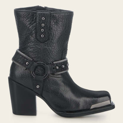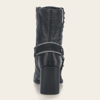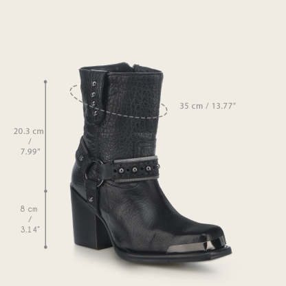 Botín biker para dama en piel genuina de bovino. Presenta correa decorativa alrededor del tobillo con herrajes y aplicación metálica en forma de herradura. En el costado presenta aplicación de estoperoles. Ajustada con cierre interno y aplicación elástica forrada en piel para mejor ajuste. Cuenta con las nuevas tecnologías: tubo con entretelas suaves, planta Ortholite y plantilla flex removible.