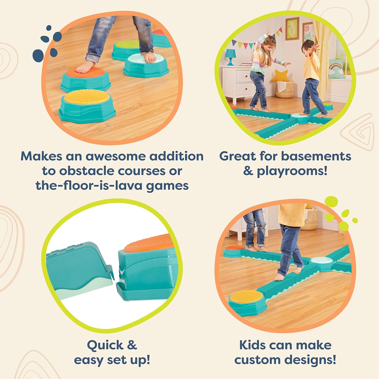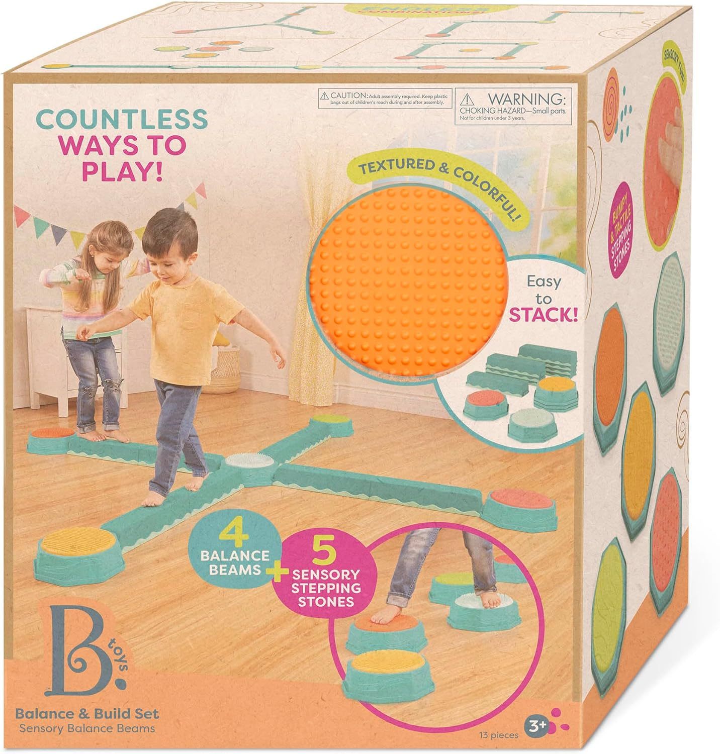 Mantén tu equilibrio y pasa de piedra a piedra con el juego Balance & Built de B. toys. Este colorido juego de barras de equilibrio es un juguete versátil que permite a los niños ser creativos mientras se mantienen activos. Consta de 8 secciones de vigas y 5 piedras sensoriales que puedes conectar y construir un recorrido de equilibrio. Gracias al diseño simple y versátil, los niños pueden crear infinitas combinaciones: simplemente coloque las caras alegres en las vigas y presione hacia abajo. Equilibrar siempre es una gran diversión, pero espera hasta llegar a las escalones! Son sensoriales y tienen un diseño desigual que agrega un poco de tacto a la diversión del juego. Construye una barra larga, un recorrido en zigzag o cualquier otra cosa que puedas imaginar: ¡es una brisa! Jugar con este juego de barras de equilibrio incluso ayuda al desarrollo físico de los niños, mejorando sus habilidades motoras gruesas y manteniéndolos activos. ¡Sin mencionar que este juego se puede guardar fácilmente apilando las vigas y los reposapiés! Recomendado para niños a partir de 3 años.