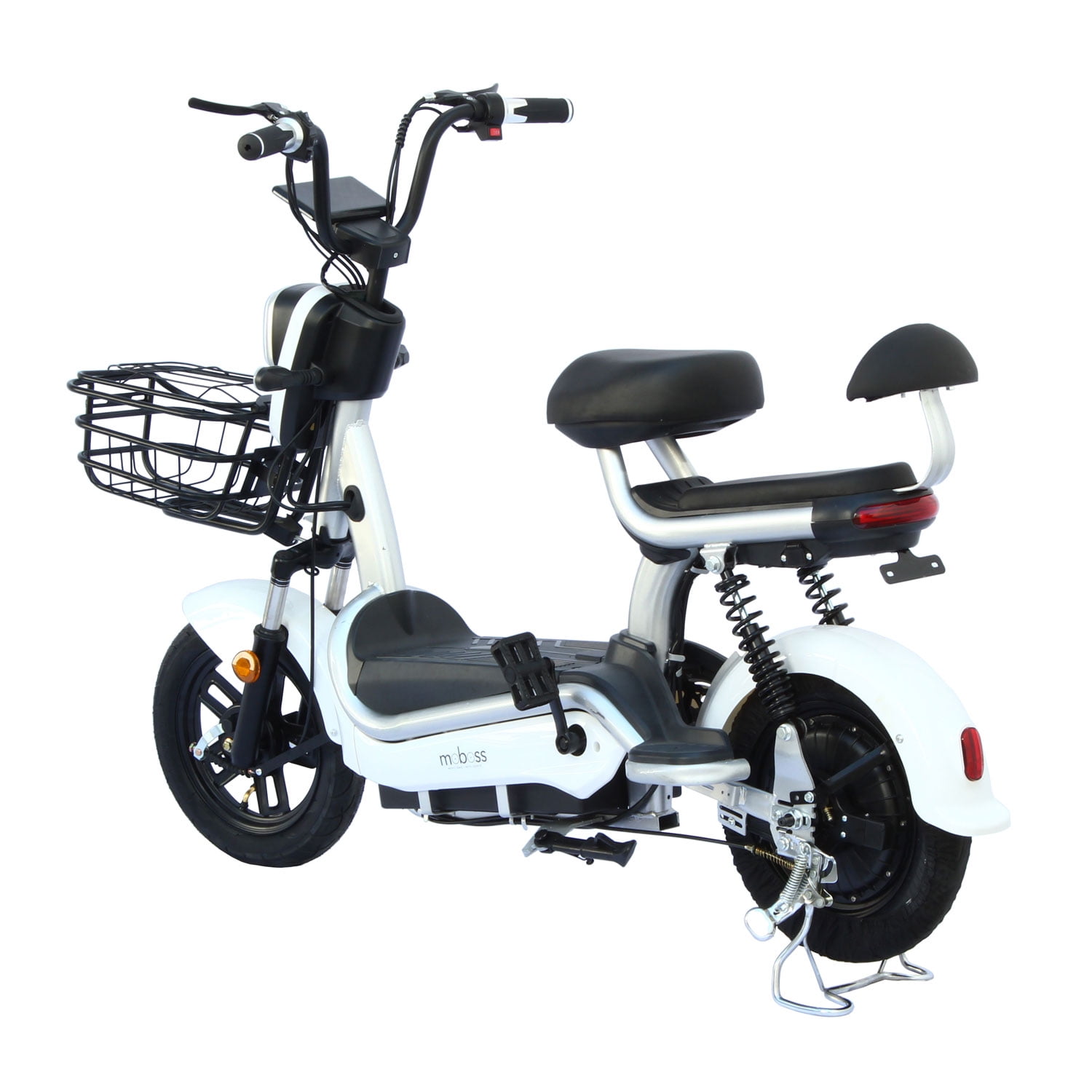 Bicicleta eléctrica rodada 14” con motor de 350W y batería de 48V 20A. Con una autonomía promedio de 60 a 70 km de distancia con una velocidad máxima de hasta 25km/h. Ideal para trasladarte a tu lugar de trabajo, escuela o negocio de manera ecológica y eficiente. Tiene una capacidad máxima de carga de hasta 150kg. Trasladate con mayor comodidad gracias a sus suspensiones en la parte delantera y posterior, cuenta además con canasta frontal donde podrás cargar tu mochila, bolso o compras y un asiento trasero diseñado para niños mayores de 7 años. Cuenta con luces al frente, atrás y al frenar, además de un parador en la llanta trasera que te permitirá estacionar la bicicleta con mayor facilidad. Tiempo de carga de la batería: 6 a 8 horas. Haz tus recorridos diarios más divertidos y sé parte del cambio en la movilidad urbana. ---------- Incluye cargador de batería. Evite utilizar el producto bajo la lluvia y mantenga la batería alejada del agua. *El tono de color del producto puede variar debido a la iluminación del ambiente y el brillo de los diferentes dispositivos.
