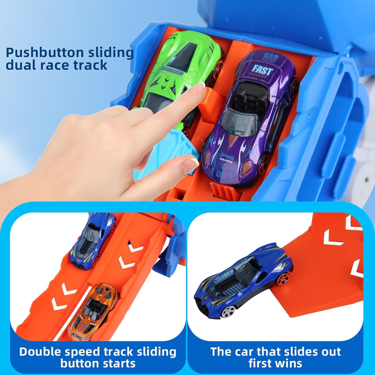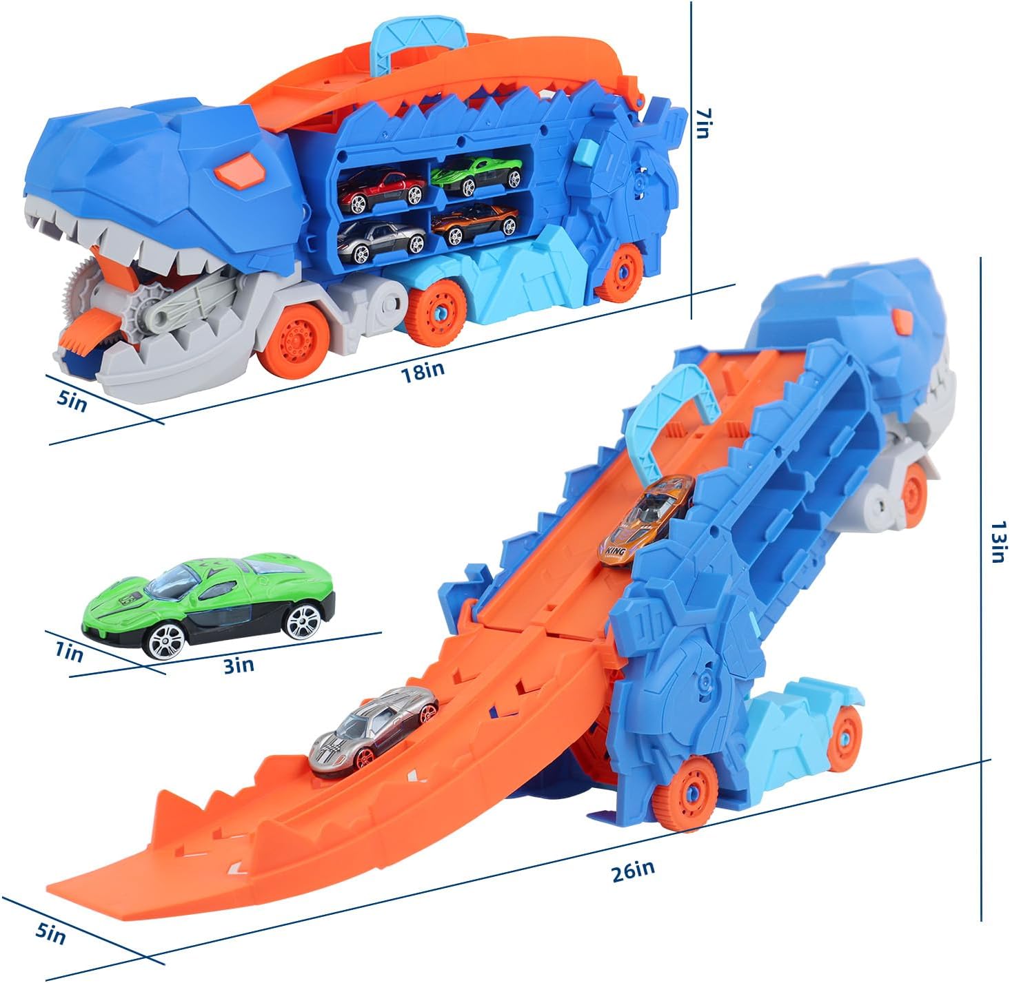 Aventura de dinosaurio de transporte multifuncional: ¡desata la aventura con nuestro coche de dinosaurio de transporte 3 en 1! Diseñado para niños de 3 a 6 años, es algo más que un coche: también es un espacio de almacenamiento con capacidad para 16 coches pequeños y una pista de carreras de dos filas para emocionantes carreras. Transfórmalo en un dinosaurio de pie para despertar la imaginación.