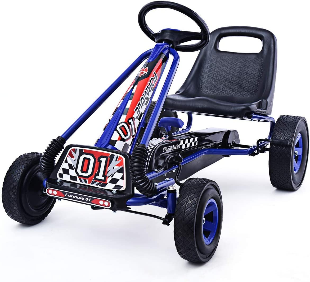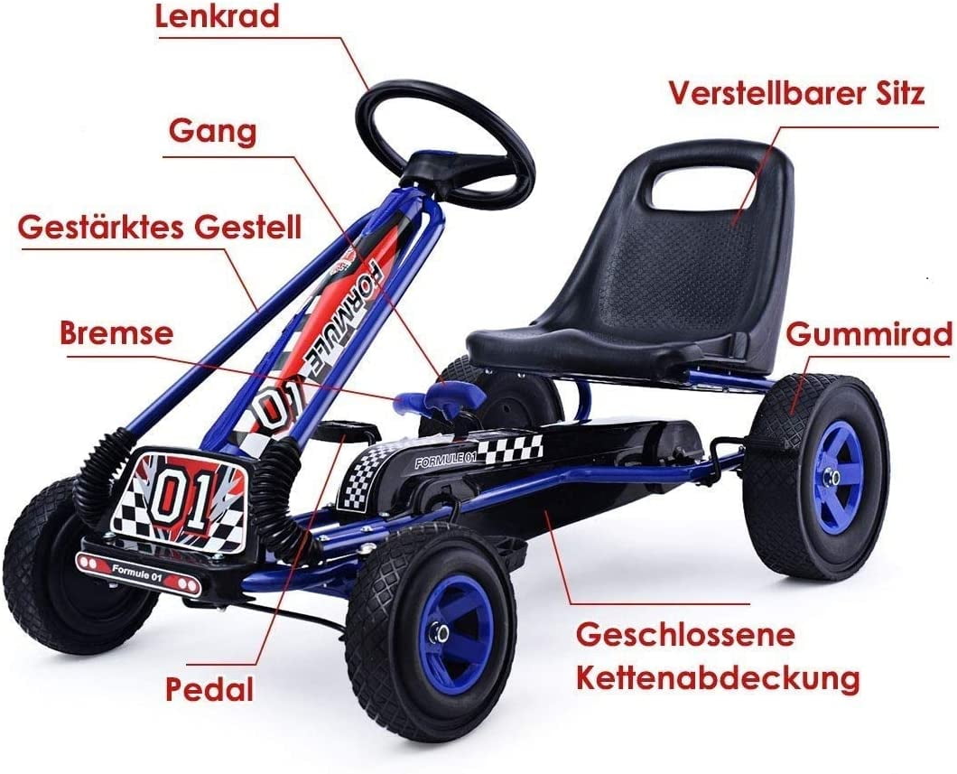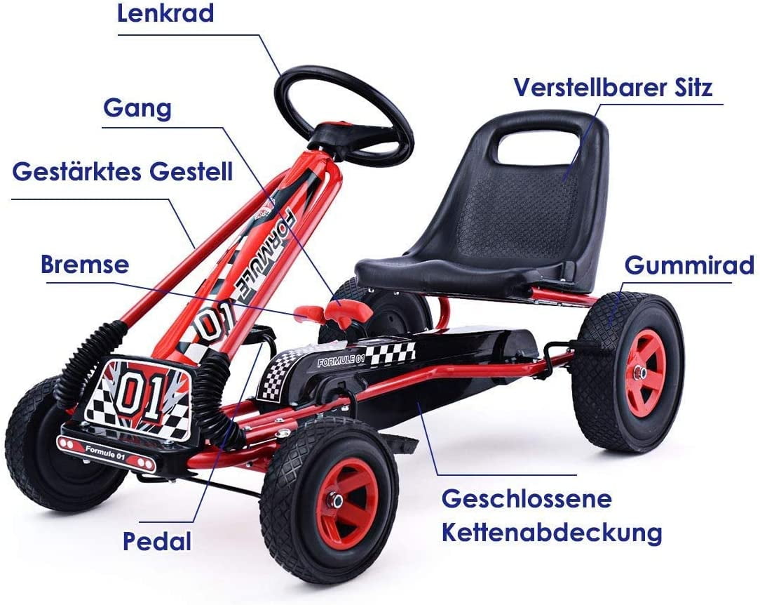 Nuestro pedal-kart es genial y cumple con todos los requisitos de seguridad. El asiento es ajustable y perfecto para niños en crecimiento. Con este GoKart jugar al aire libre es realmente divertido. Este racer negro de cuatro ruedas es mucho más estable que un triciclo.