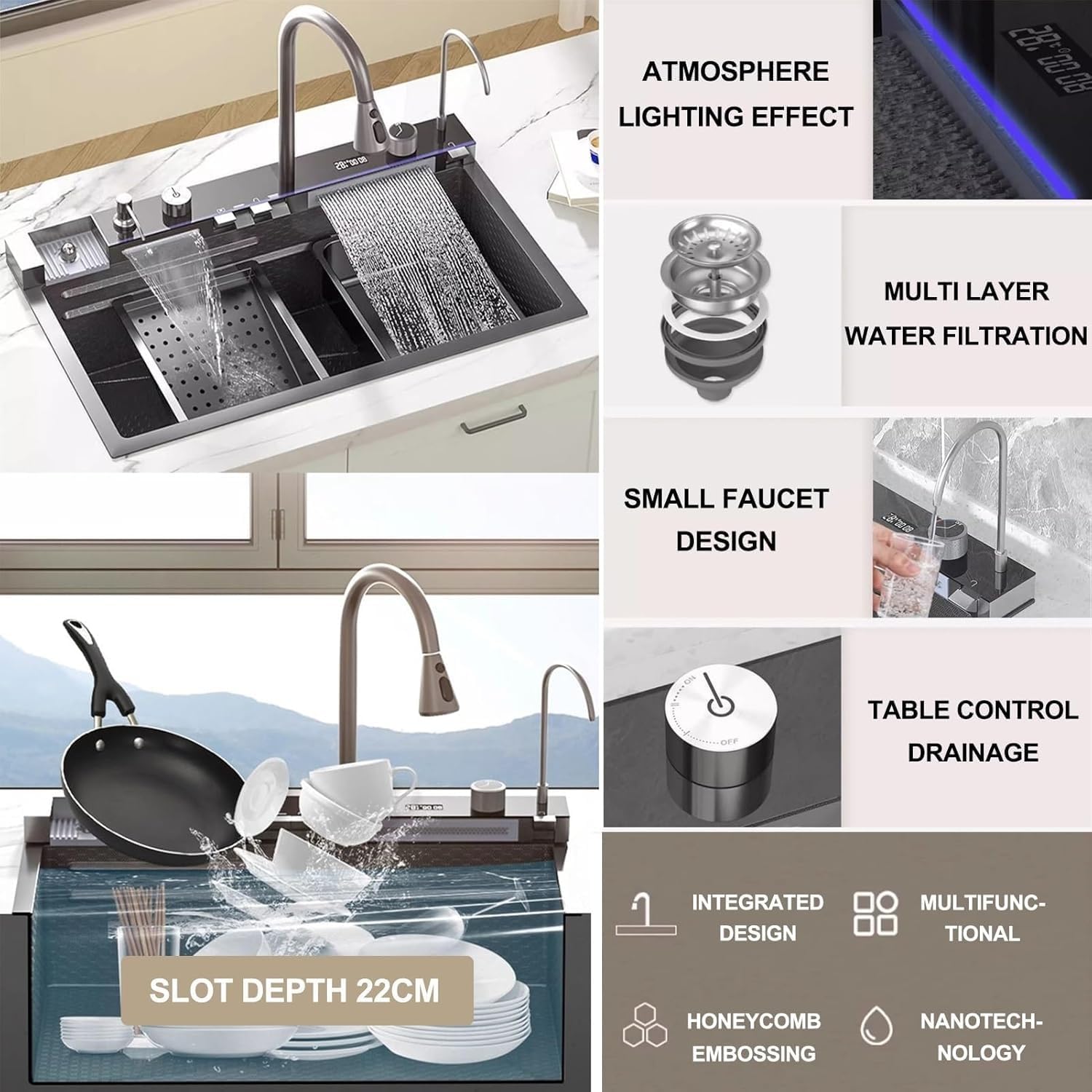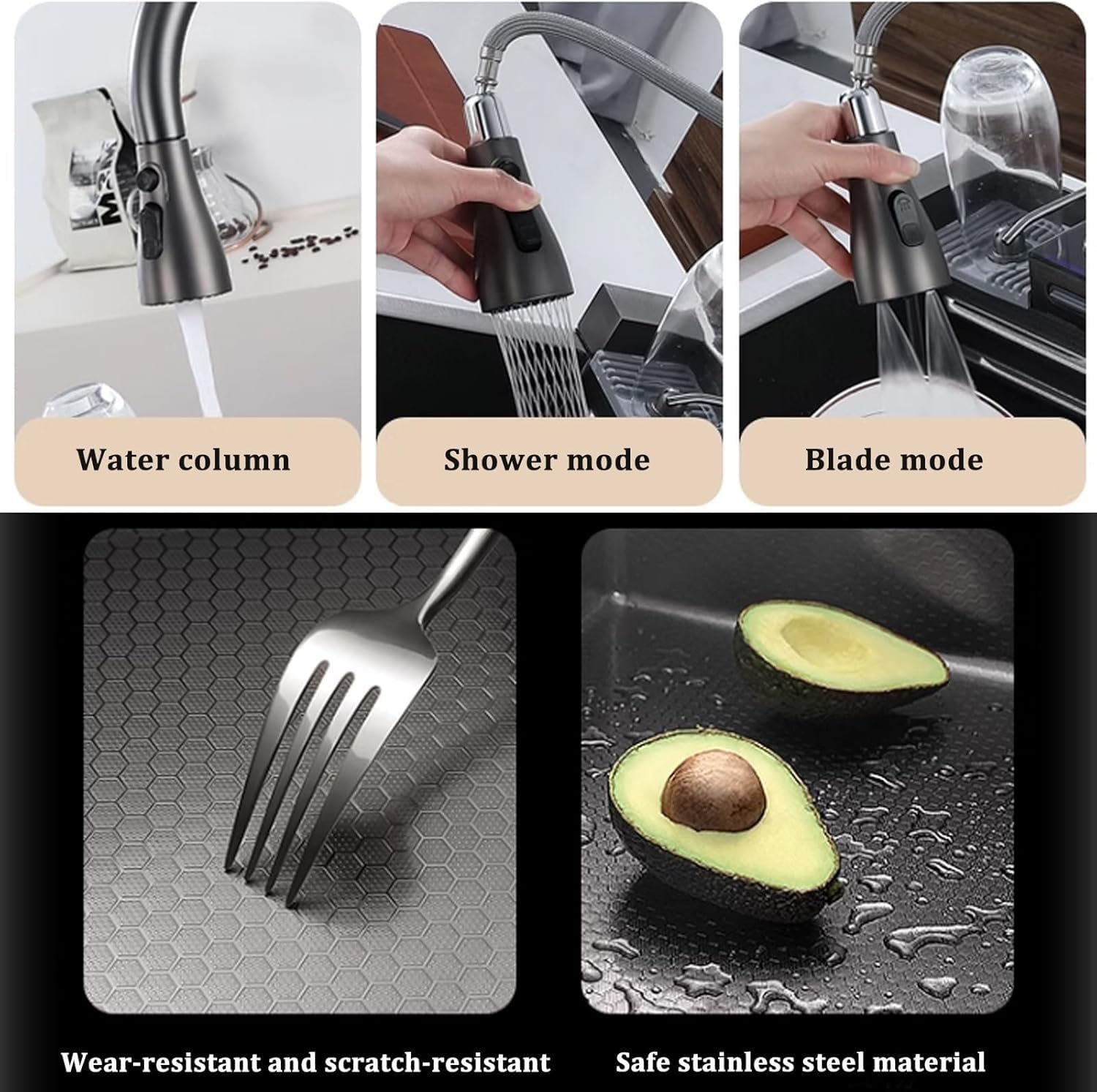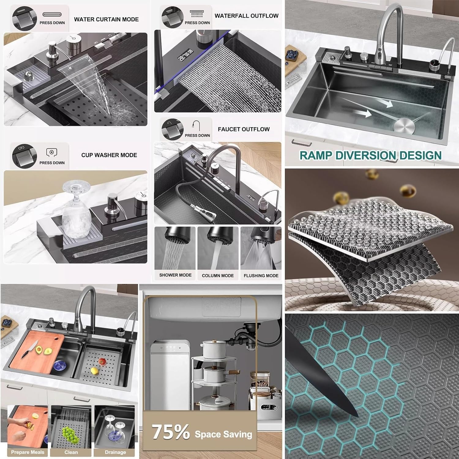 Fregadero de acero inoxidable 304 de un solo tazón * 1 Grifo de acero inoxidable 304 de 360° * 1 Dispensador de jabón * 1 Conjunto de tuberías de desagüe * 1 Manguera flexible de agua fría y caliente * 1 Válvula de ángulo de dos vías * 1 Válvula de ángulo de tres vías * 1 Fregadero empotrado * 1 Cesta triangular * 1 Tabla de cortar de madera maciza * 1 Grifo purificador de agua * 1 Lavadora de vasos * 1 |