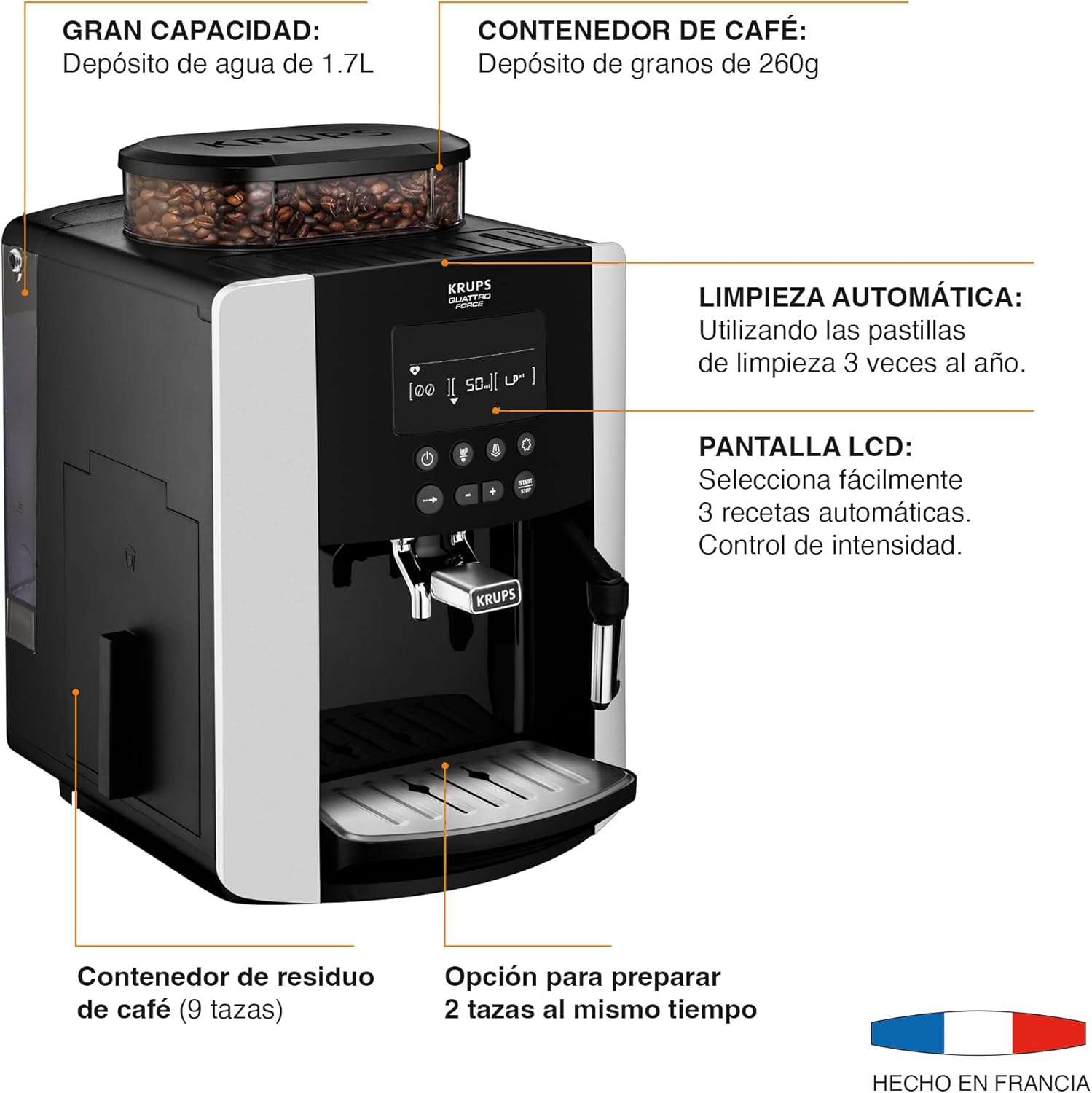 TECNOLOGÍA: Quattro Force optimiza cada paso del proceso de preparación de espresso, desde el grano hasta la taza. Incluye molino con 3 niveles de molienda