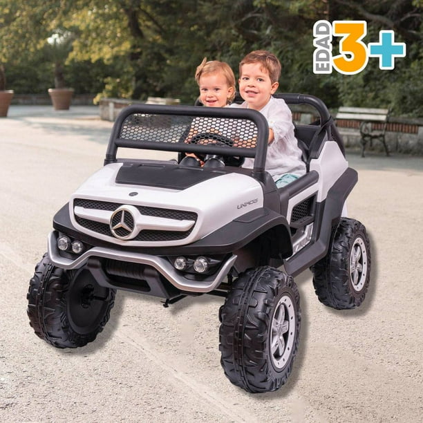 El espíritu aventurero de tu hijo crecerá con el nuevo MERCEDES BENZ UNIMOG 12V. Tu hijo pasará horas de diversión a bordo de un compañero más, este carrito permite hasta dos usuarios soportando máximo 40 kg de peso. La operación y manejo del MERCEDES BENZ es súper segura ya que cuenta con velocidad máxima de 6 km/h, cuenta con suspensión trasera.