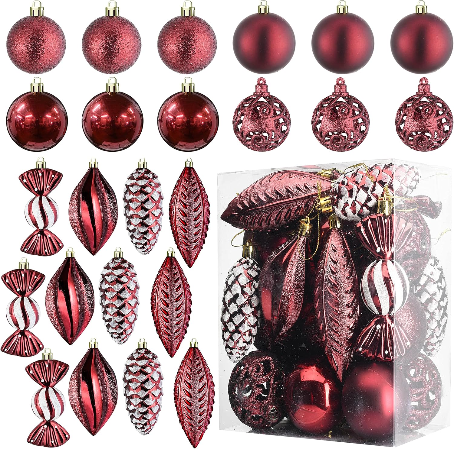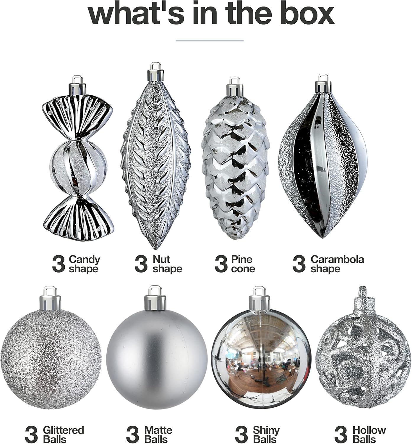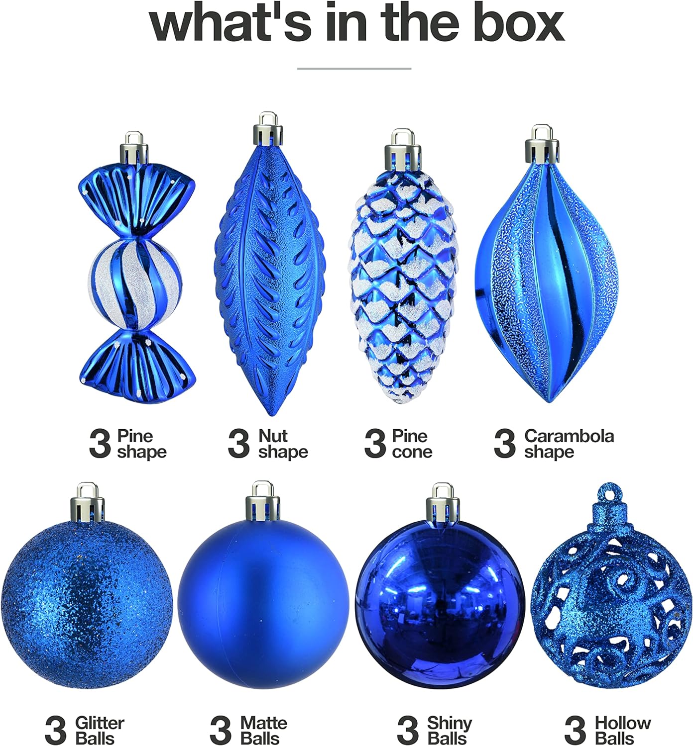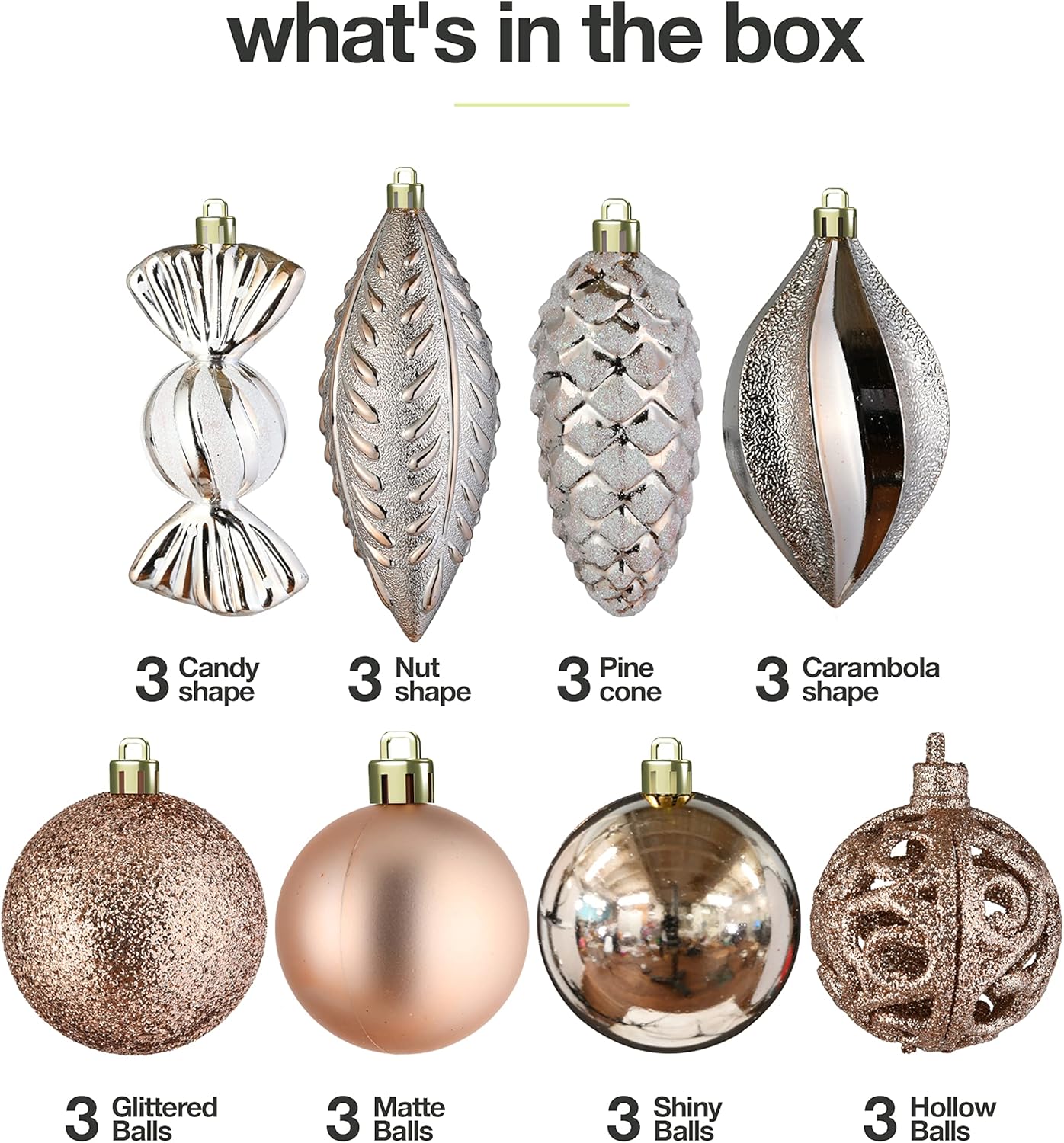 Juego completo de decoración de 24 piezas: incluye 8 bolas pequeñas (1.5 pulgadas), 8 medianas (2.3 pulgadas) y 8 grandes (3.1 pulgadas). Un juego de adornos para árbol de Navidad ideal para una cobertura de decoración equilibrada