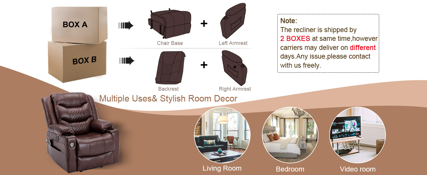El sillón reclinable se envía con 2 cajas ya que el sillón es grande.El tiempo de entrega es diferente debido a 2 transportistas. Si no lo recibe, póngase en contacto con nosotros libremente en cualquier momento.
