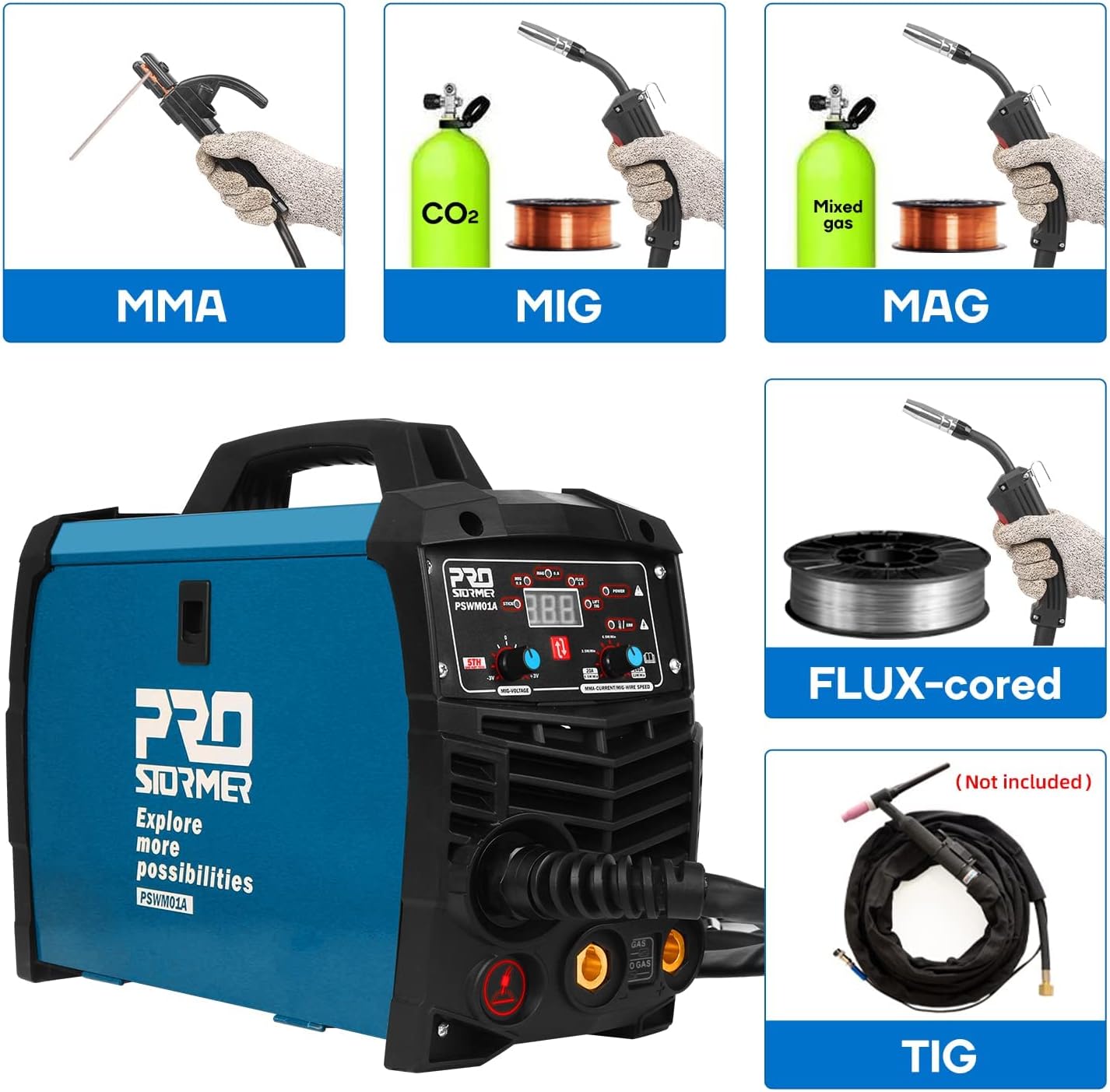 - Diseño práctico: si eres un principiante, puedes seleccionar nuestro modo de uso preestablecido en el panel de control de la máquina; si eres un competente, puedes ajustar los parámetros de la máquina girando la perilla. Y esta máquina de soldadura Prostormer es adecuada para levantar TIG, flujo MIG, gas MIG, etc.