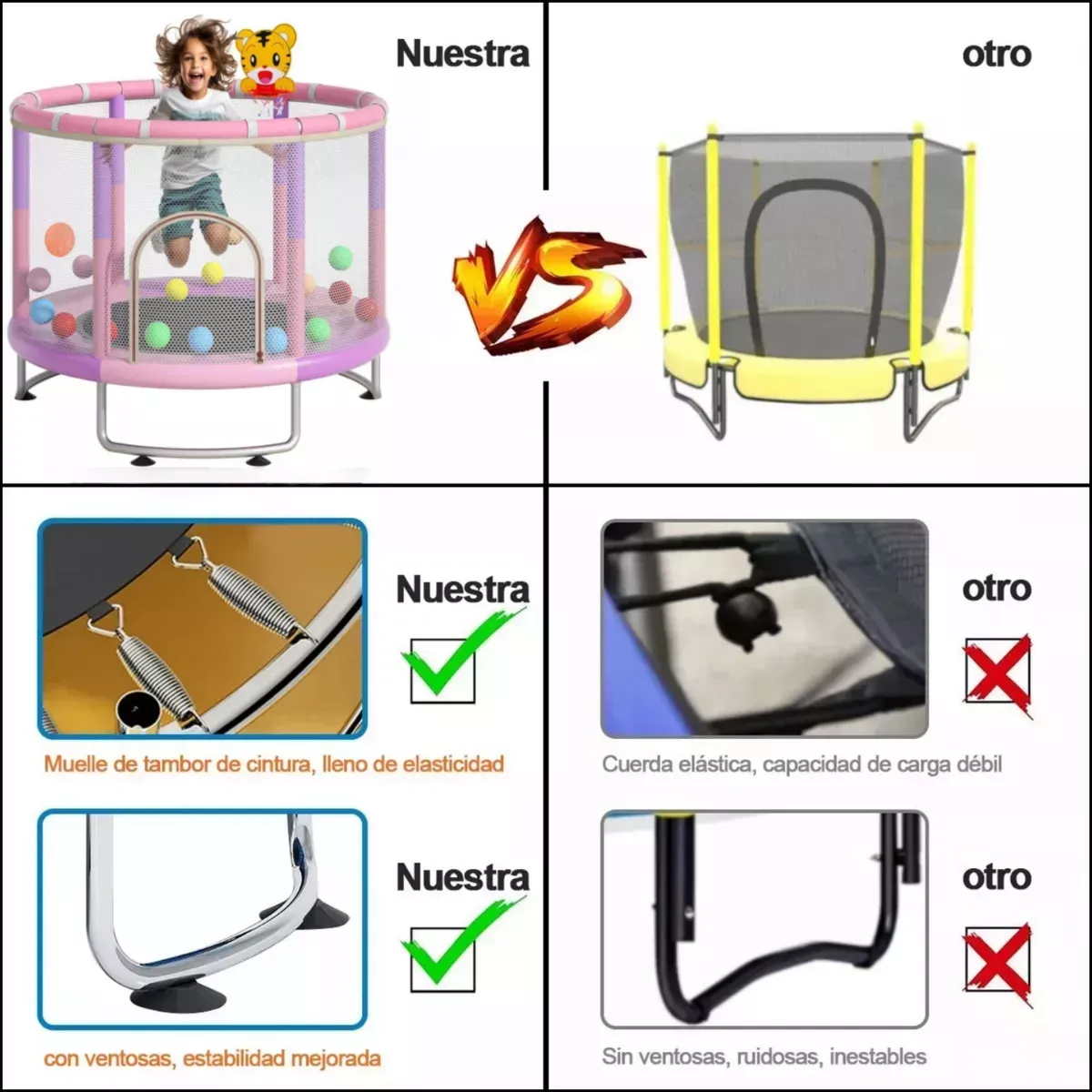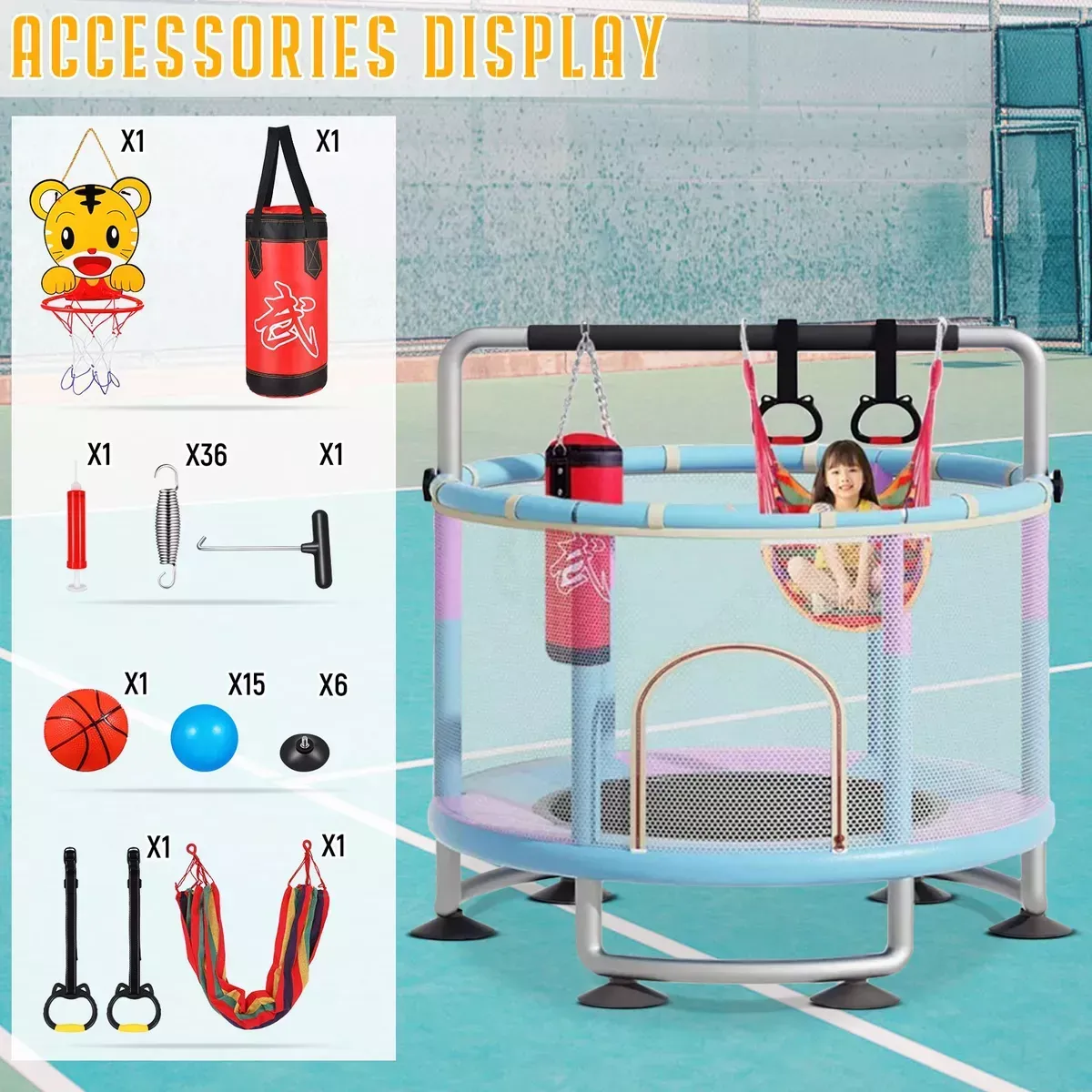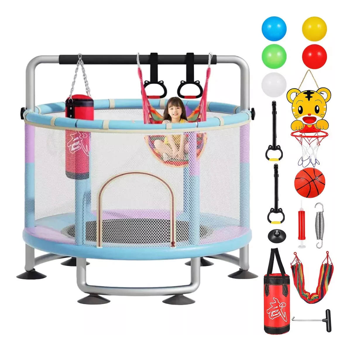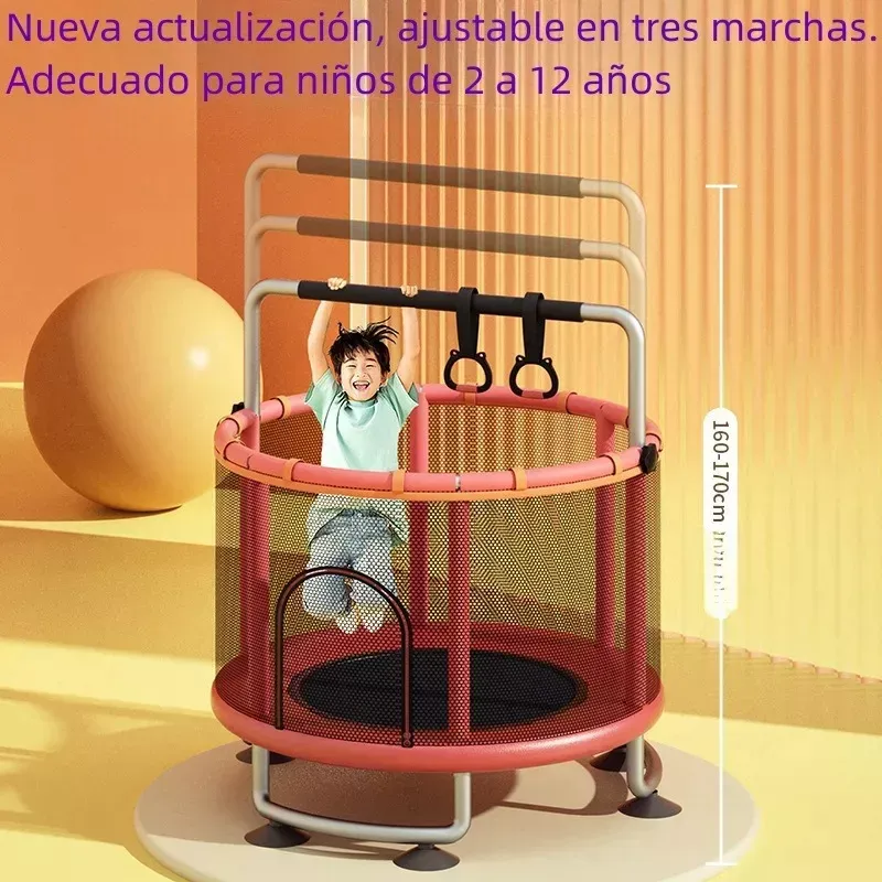 El paquete contiene Trampolín de 1.4m: 1 Bolsa de arena: 1 Cesta: 1 Baloncesto infantil: 1 docena Cilindro de gas: 1 Anillos de elevación: 2 Columpios para niños: 1 Bolas marinas: 15 Las especificaciones Material: acero + tela de nylon Carga máxima: 300KG Tamaño del producto: diámetro 1.4m, altura 1.5-1.7m Edad aplicable: 2-12 años Cantidad recomendada: 2-4 niños Chasis de anillo modificado La carga máxima es de 300kg, el marco inferior de anillo mejorado es anti-volteo, la ventosa silenciosa es más estable. Hecho de tubos de acero galvanizados para repeler eficazmente el agua y la corrosión. También tiene un recubrimiento antioxidante mejorado para garantizar una experiencia segura en el trampolín. Diseño de seguridad a prueba de fugas tela de alta bala Engrosado cifrado 360° malla de protección, la versión actualizada de la parte inferior de la malla de protección es extraíble. Tela de alta rebote cosido a mano, 3 capas de almohadilla de seguridad engrosada, primavera de tambor de cintura engrosada personalizada, durable y sin deformación, proporciona protección de seguridad para sus hijos. Ventosas silenciosas mejoradas Tubo de espuma anticolisión engrosado, pierna tipo anillo inferior para estabilizar el trampolín. El tubo inferior del anillo está equipado con 6 ventosas silenciosas mejoradas, que son efectivamente silenciosas y anti-caídas. Deje que los niños salten felices y seguros en el trampolín. Brazo multifuncional con tres niveles de ajuste de altura Incluye tres niveles de diseño de barra horizontal de altura ajustable, se puede ajustar entre 150 cm y 170 cm, ayuda a los niños a saltar, columpio, boxeo, escalada y otras actividades con seguridad, de modo que los niños pueden jugar en el trampolín con tranquilidad. Ideal para que los niños hagan ejercicio y se liberen de la tentación de la electrónica. Fácil de montar con accesorios completos Incluye instrucciones de instalación en español. Puede escanear el código qr en las instrucciones para ver el video de instalación del trampolín. Accesorios de juego como anillos de elevación, columpios, bolsas de arena, bolas marinas, canastas de baloncesto y otros accesorios para proporcionar más diversión para los niños saltando.