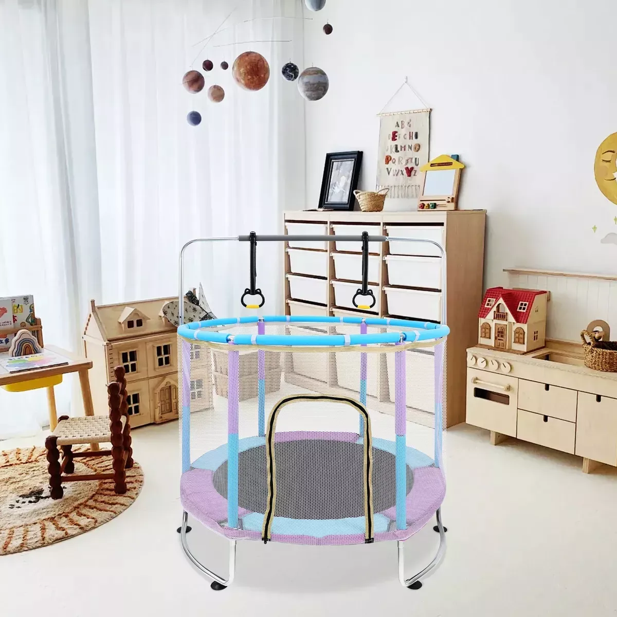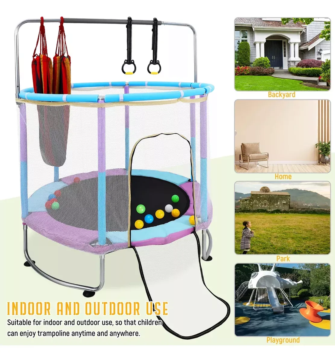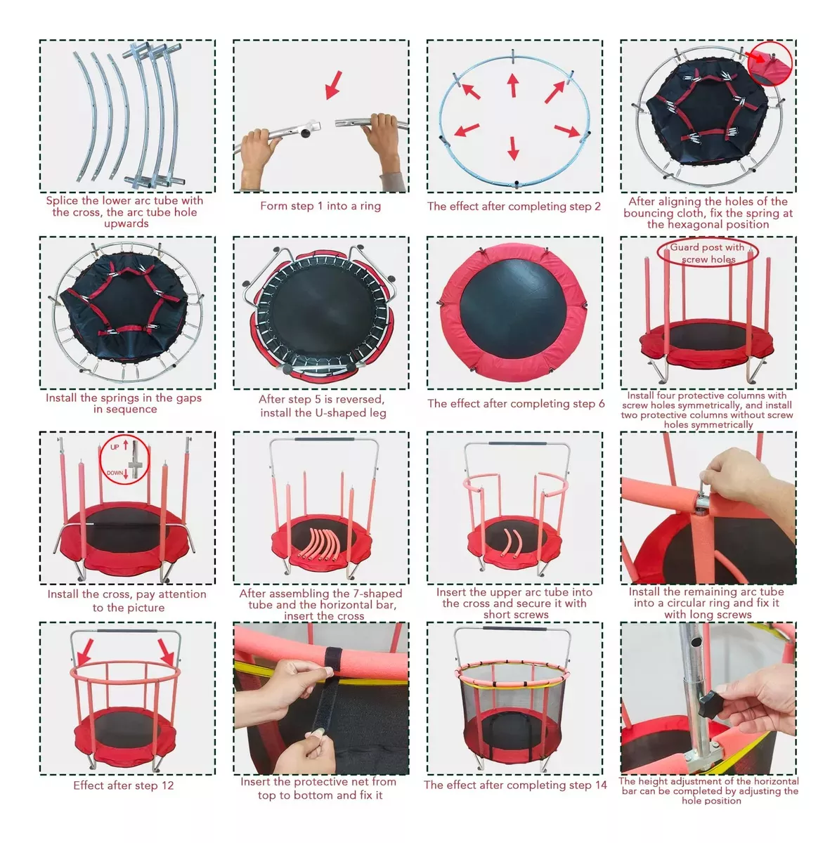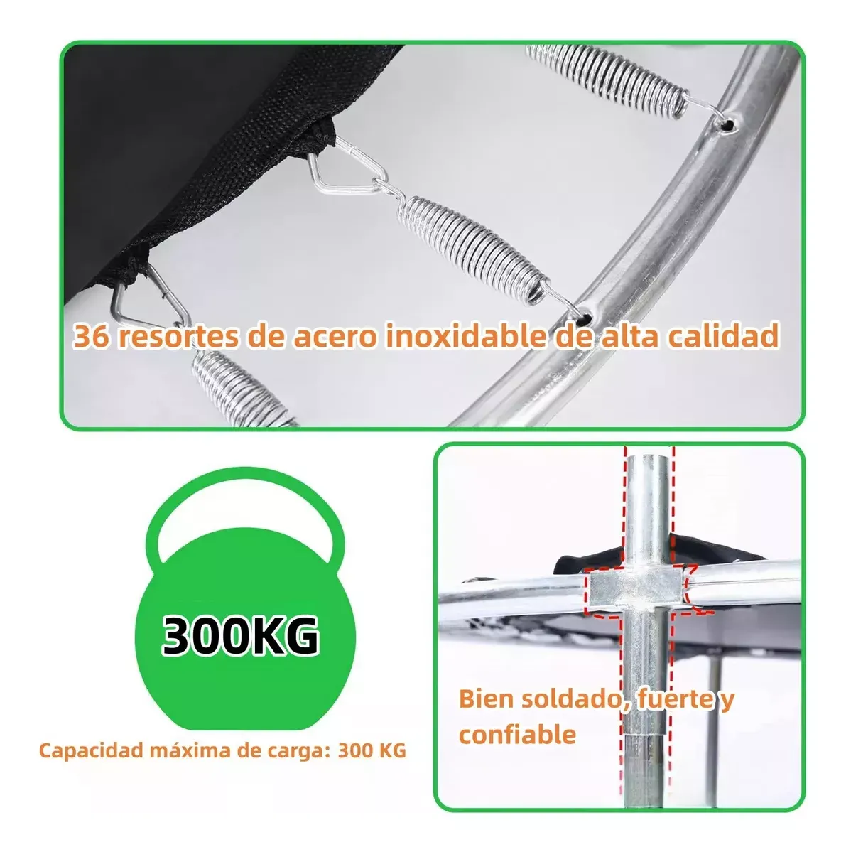 El paquete contiene Trampolín de 1.4m: 1 Bolsa de arena: 1 Cesta: 1 Baloncesto infantil: 1 docena Cilindro de gas: 1 Anillos de elevación: 2 Columpios para niños: 1 Bolas marinas: 15 Las especificaciones Material: acero + tela de nylon Carga máxima: 300KG Tamaño del producto: diámetro 1.4m, altura 1.5-1.7m Edad aplicable: 2-12 años Cantidad recomendada: 2-4 niños Chasis de anillo modificado La carga máxima es de 300kg, el marco inferior de anillo mejorado es anti-volteo, la ventosa silenciosa es más estable. Hecho de tubos de acero galvanizados para repeler eficazmente el agua y la corrosión. También tiene un recubrimiento antioxidante mejorado para garantizar una experiencia segura en el trampolín. Diseño de seguridad a prueba de fugas tela de alta bala Engrosado cifrado 360° malla de protección, la versión actualizada de la parte inferior de la malla de protección es extraíble. Tela de alta rebote cosido a mano, 3 capas de almohadilla de seguridad engrosada, primavera de tambor de cintura engrosada personalizada, durable y sin deformación, proporciona protección de seguridad para sus hijos. Ventosas silenciosas mejoradas Tubo de espuma anticolisión engrosado, pierna tipo anillo inferior para estabilizar el trampolín. El tubo inferior del anillo está equipado con 6 ventosas silenciosas mejoradas, que son efectivamente silenciosas y anti-caídas. Deje que los niños salten felices y seguros en el trampolín. Brazo multifuncional con tres niveles de ajuste de altura Incluye tres niveles de diseño de barra horizontal de altura ajustable, se puede ajustar entre 150 cm y 170 cm, ayuda a los niños a saltar, columpio, boxeo, escalada y otras actividades con seguridad, de modo que los niños pueden jugar en el trampolín con tranquilidad. Ideal para que los niños hagan ejercicio y se liberen de la tentación de la electrónica. Fácil de montar con accesorios completos Incluye instrucciones de instalación en español. Puede escanear el código qr en las instrucciones para ver el video de instalación del trampolín. Accesorios de juego como anillos de elevación, columpios, bolsas de arena, bolas marinas, canastas de baloncesto y otros accesorios para proporcionar más diversión para los niños saltando.