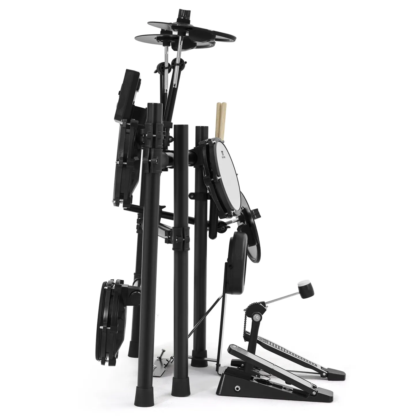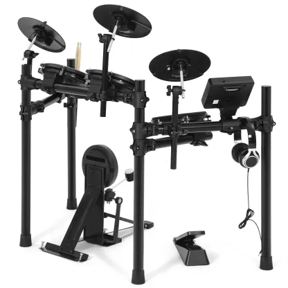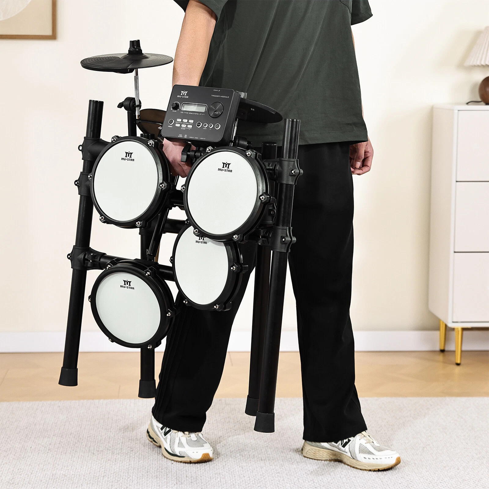 Si necesitas practicar tus canciones favoritas, puedes conectar tu computadora o MP3. Puedes utilizar tus auriculares para practicar sin hacer ruido. La batería electrónica Mustar es más adecuada para practicar en casa, bajando el volumen que la batería acústica con decibelios más fuertes. Cuando necesites realizar al aire libre, puedes plegar el soporte para ahorrar mucho espacio y es más conveniente.