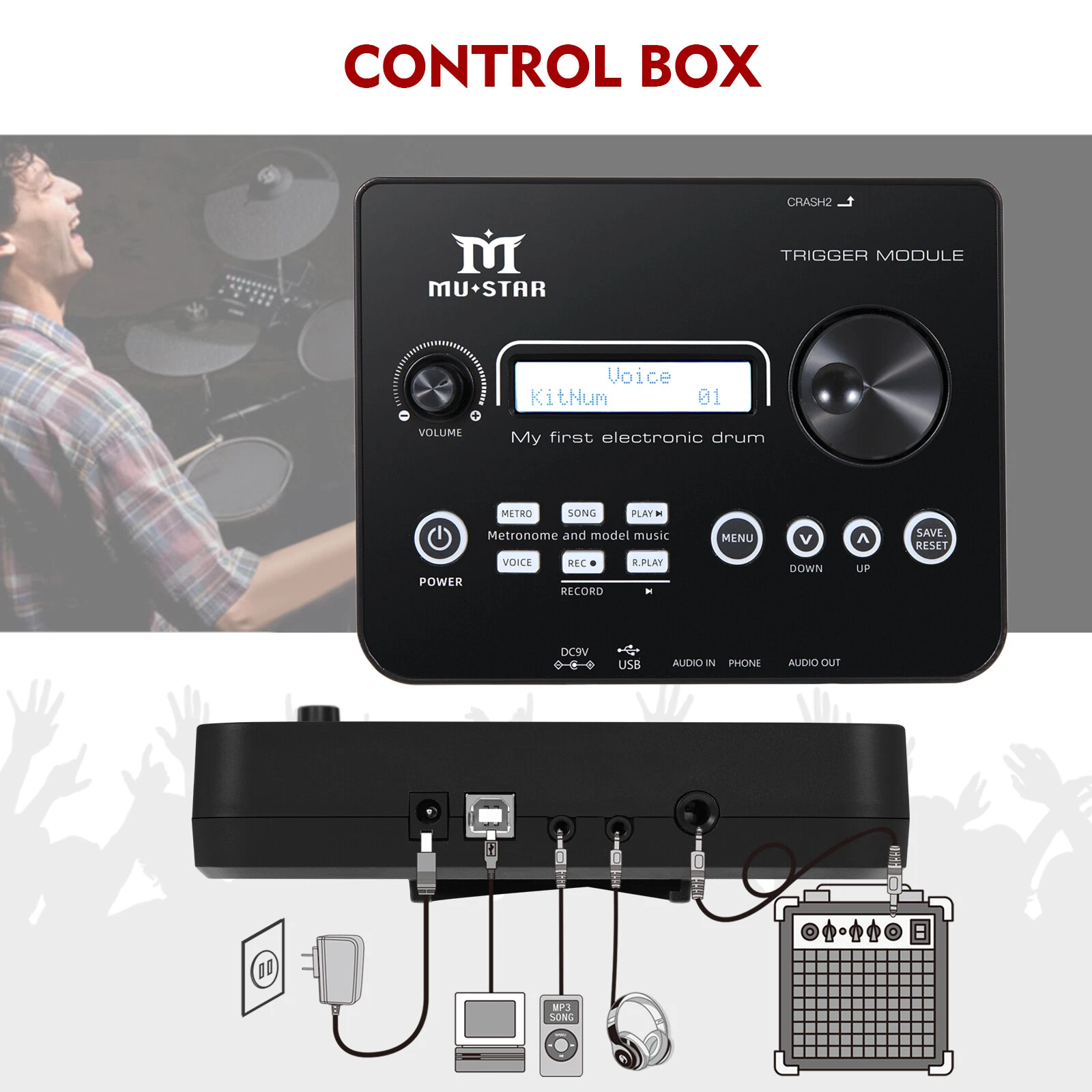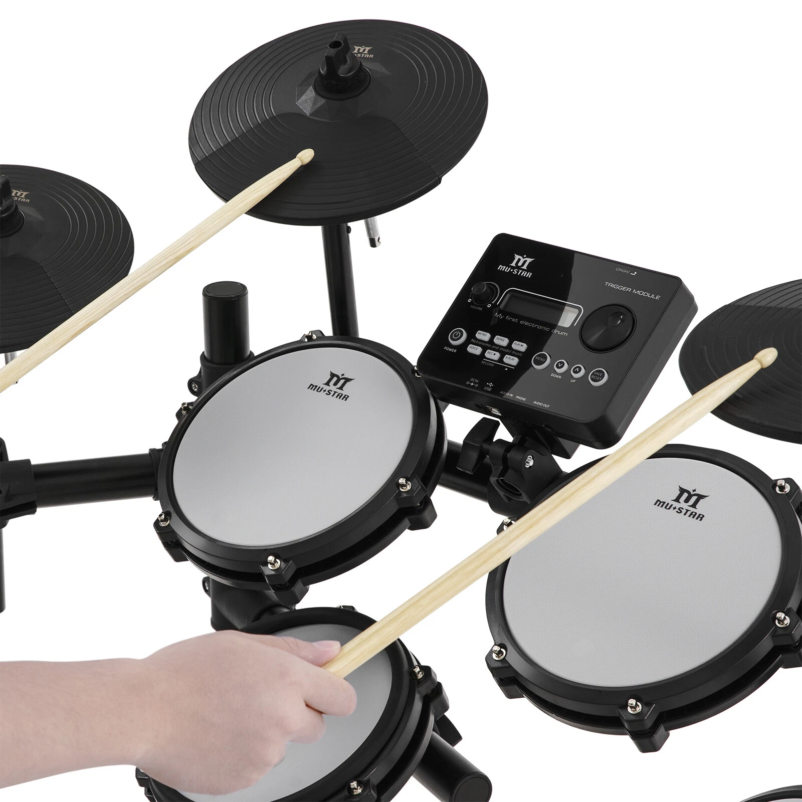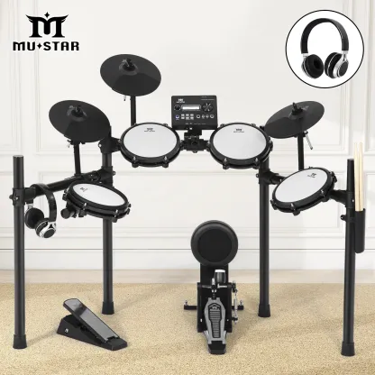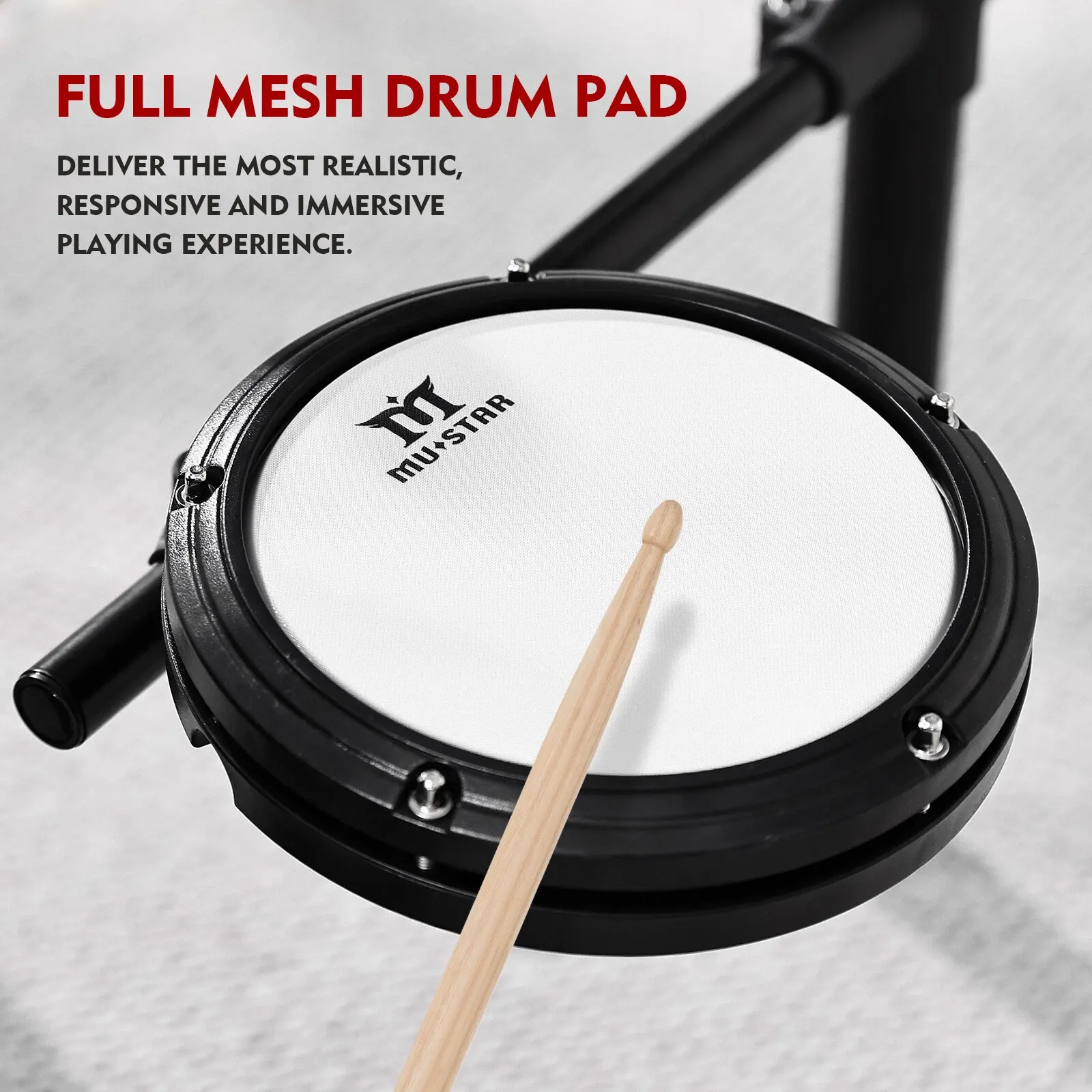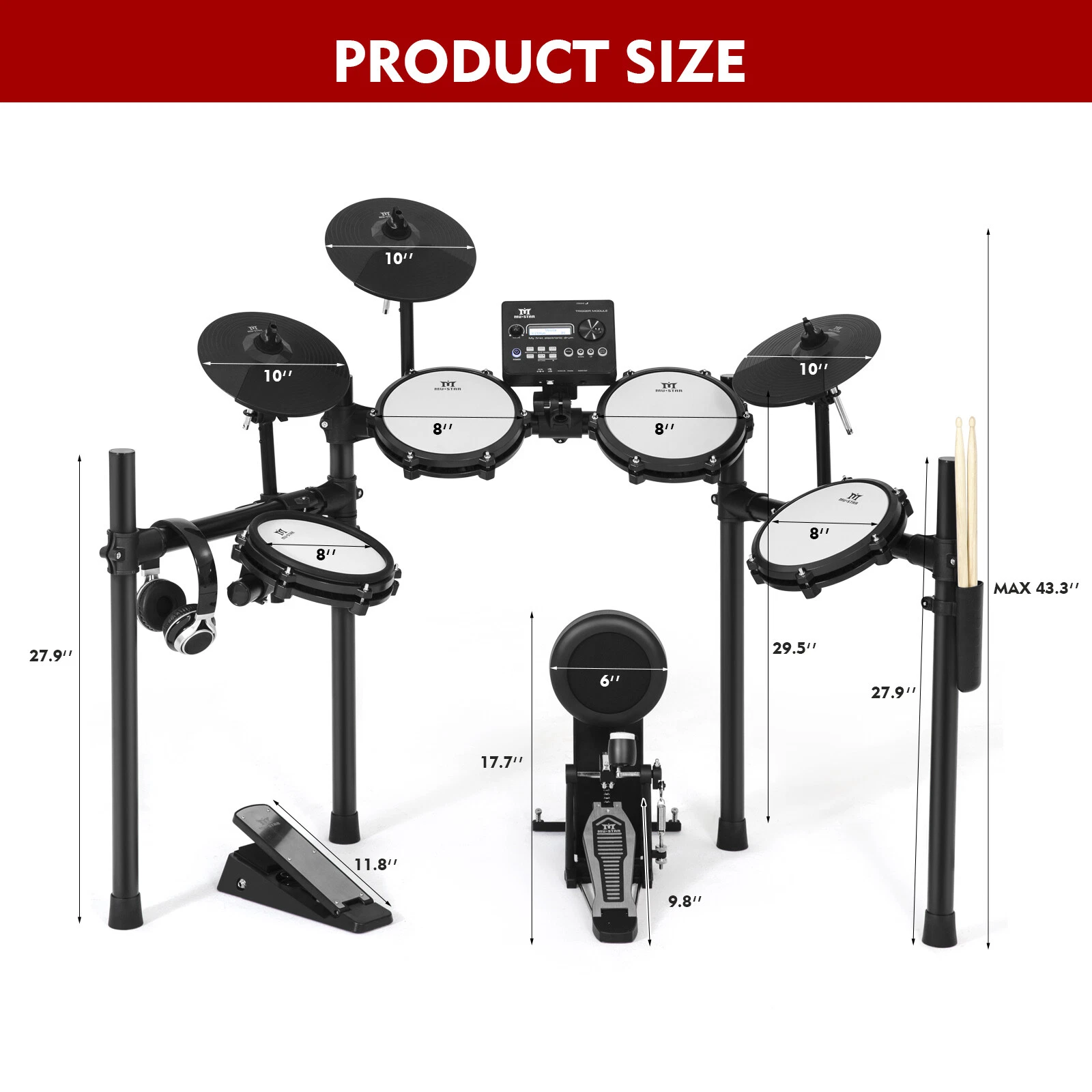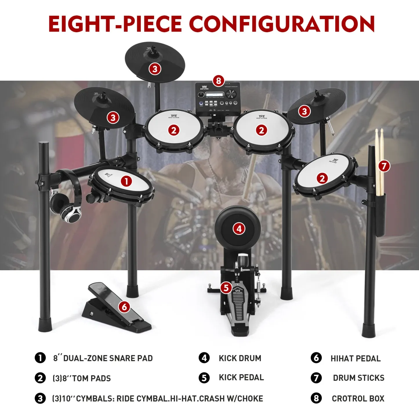【Juego de batería de 8 piezas de alta calidad】: MUSTAR elecEl juego de batería tric viene con caja de doble zona de 8'' tom x 3, 8'' x 1, 10'' hi-hat x 1, 10'' ride x 1, 10'' crash x 1, pedal de bombo x 1, pedal hi-hat x 1, cable de audio x 1, Stompers x 1, baquetas x 2, cubo de baquetas, auriculares, etc. incluyendo todo lo que un baterista necesita para lograr su sueño musical.