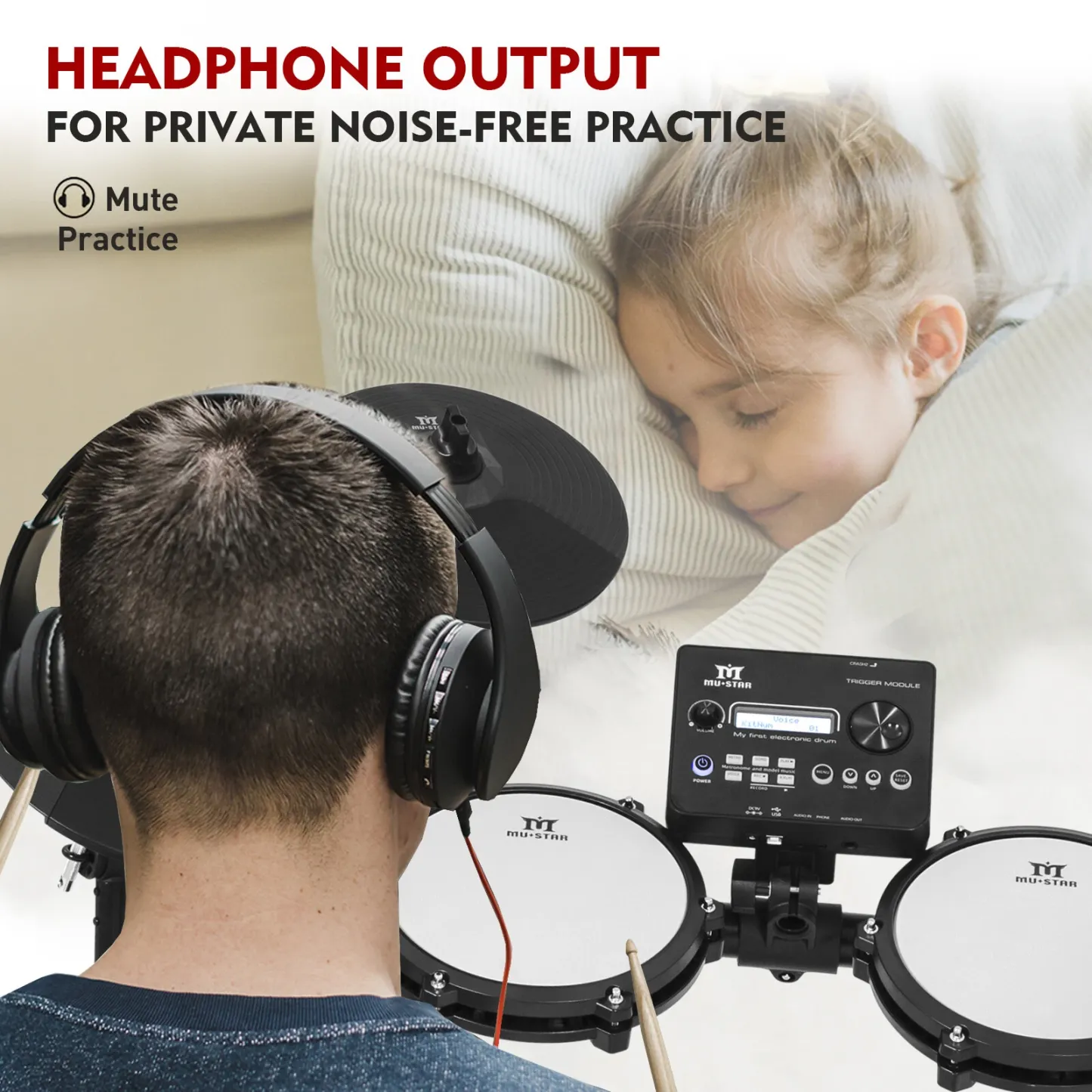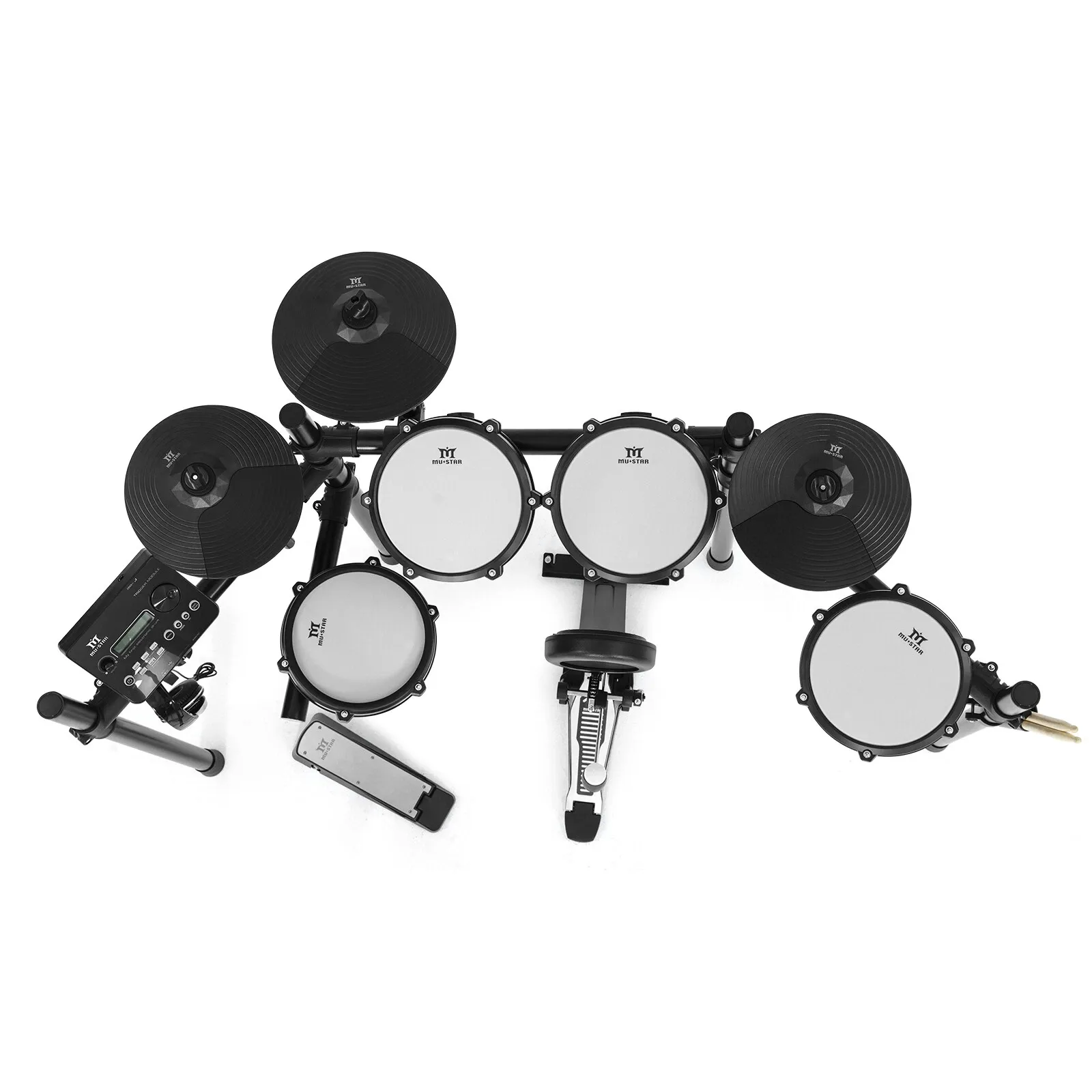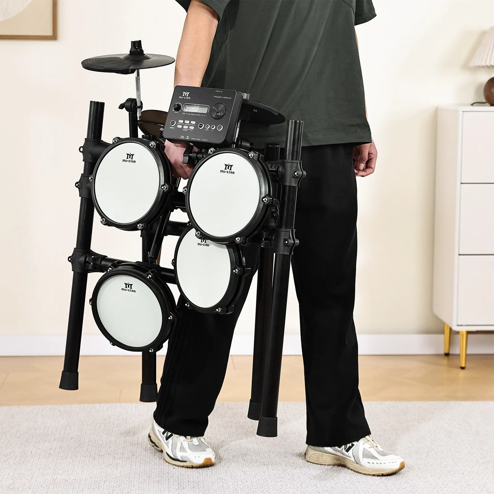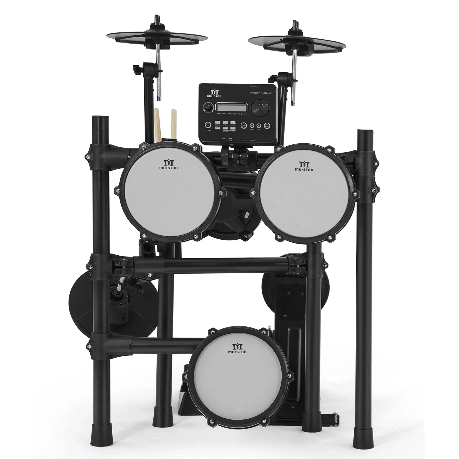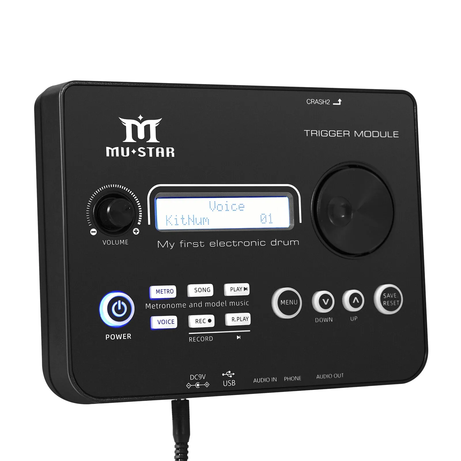 【Juego de batería de 8 piezas de alta calidad】: MUSTAR elecEl juego de batería tric viene con caja de doble zona de 8'' tom x 3, 8'' x 1, 10'' hi-hat x 1, 10'' ride x 1, 10'' crash x 1, pedal de bombo x 1, pedal hi-hat x 1, cable de audio x 1, Stompers x 1, baquetas x 2, cubo de baquetas, auriculares, etc. incluyendo todo lo que un baterista necesita para lograr su sueño musical.