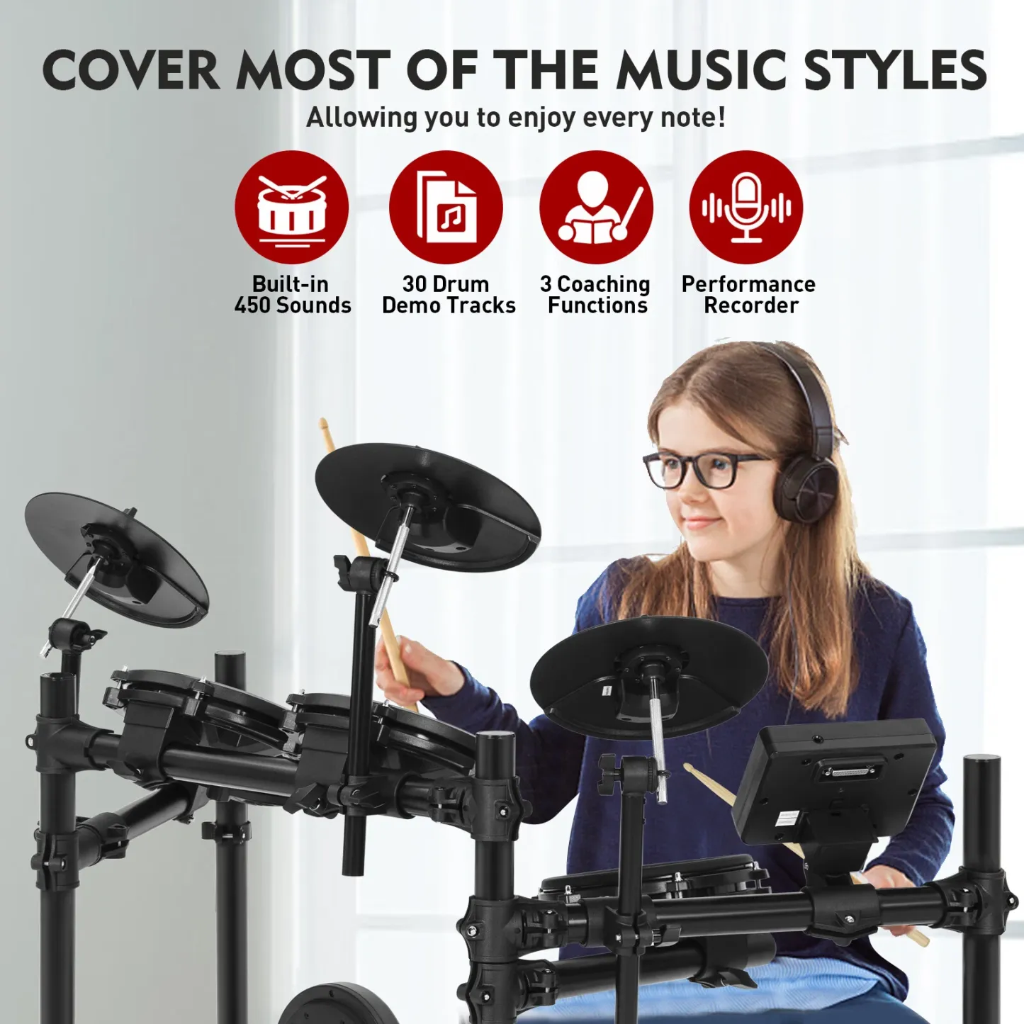 【Múltiples tonos para elegir】: 30 juegos de kit de batería y un juego de kit de batería personalizado, 9 ritmos, 450 tonos, viene con 30 canciones de demostración, cubre la mayoría de los estilos de música, lo ayudan a aprender mejor.