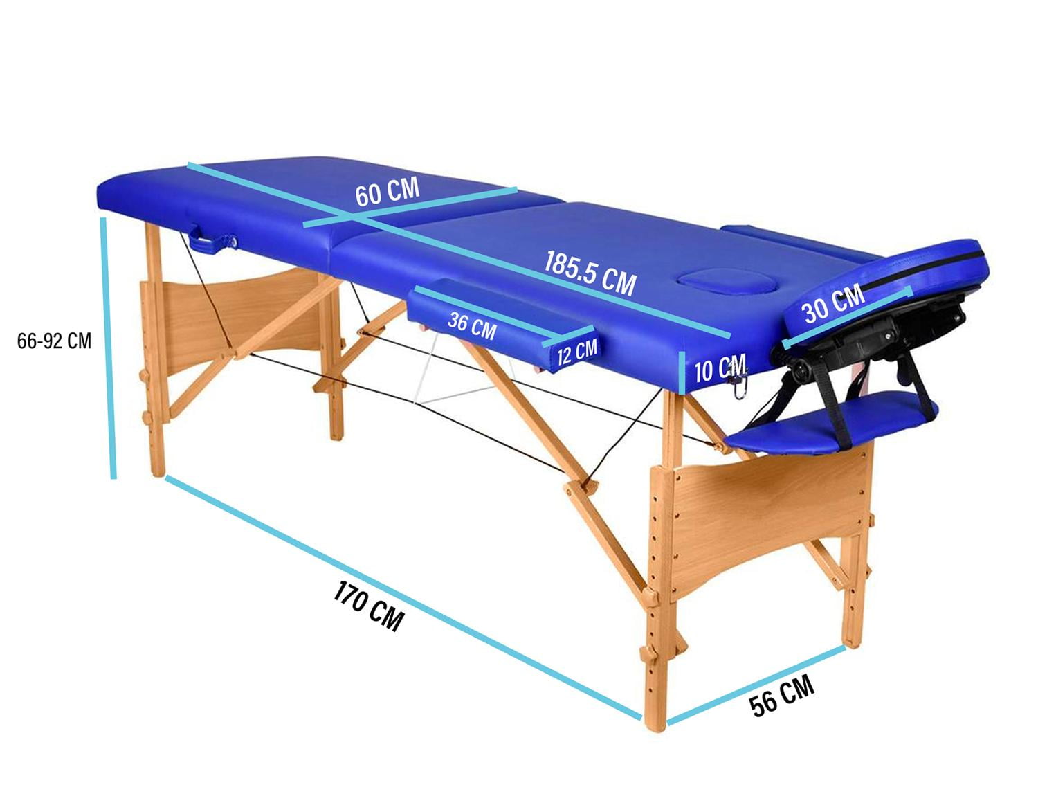 DIMENSIONESLARGO: 185.5 CMANCHO: 60 CMGROSOR: 10CMALTURA AJUSTABLE: 66 -92 CMPESO: 14 KILOSLa mejor Cama para Masaje Portátil ha sido elaborada con componentes y materiales de la más alta calidad de manera artesanal. Con el uso y cuidado adecuado, garantiza una larga vida de funcionamiento confiable, además posee un forro en vinil tipo piel. Esta cama es perfecta para spas, quiroprácticos, masajistas, tatuadores, estilistas o simplemente para ti que disfrutes de los masajes en tu hogar.La cama para masaje portátil ha sido diseñada para la comodidad de quien recibe el masaje como de quien lo da ya que permite ajustarse de 62 cm. a 84 cm. Podrás acomodarla a la altura ideal para ti, de manera fácil y segura, con sus 4 bases firmes y resistentes fabricadas en maderas finas de la mejor calidad.Esta es la única cama de masaje que es completamente personalizable. Puedes modificar su altura, el ángulo del respaldo, cabezal desmontable, descansa brazos laterales y frontal removibles con facilidad para que quien reciba el masaje disfrute de una comodidad total, plena y relajante.Además la cama para masaje portátil tiene un diseño plegable y fácil de guardar. Es ideal para que acompañarte en tus viajes y compartirlo con la familia. También perfecta para aquellos terapeutas y masajistas que ofrecen sus servicios de forma a domicilio, pues sus materiales resistentes son ideales para un uso cotidiano, además incluye una mochila de transporte con la que podrás llevarla a donde vayas.CARACTERISTICAS • Fabricada con materiales de alta calidad• Forro de vinil acabado tipo piel• Respaldo reclinable y descansa brazos laterales• Portátil y plegable• Uso profesional• Incluye mochila para transportar la cama plegableCONTENIDO1 Camilla portafolio2 bases de brazos1 Base de cabecera1 Cabecera acolchada1 Soporte para Brazos1 Bolsa transportadora