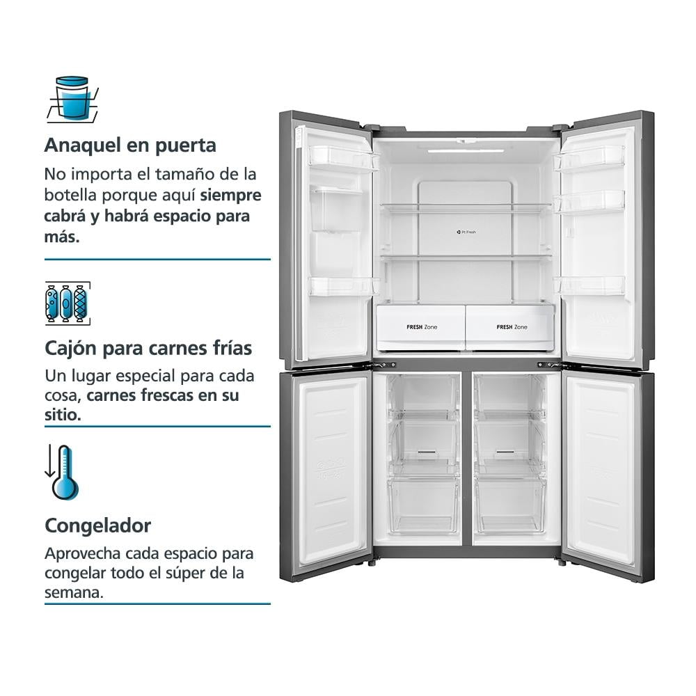 Refrigerador cuatro puertas color acero inoxidable con capacidad de 494L / 17 pies. -Jaladeras tipo pocket. Display táctil digital en puerta que permite controlar todas las funciones del refrigerador de manera sencilla e intuitiva-Despachador de agua-Enfriador: Luz LED- 6 anaqueles en contrapuerta (3 por puerta), cajón legumbrero, cajón para carnes frías / productos delicados que mantienen frutas y verduras con el nivel de humedad ideal para conservar su frescura natural-En congelador: 4 compartimientos deslizables, 2 cajones (1 por puerta). -Gran número de cajones en congelador, ideales para una mejor organización y conservación de los alimentos¡Mantén tus alimentos frescos y organizados con nuestros increíbles refrigeradores! Diseñados pensando en tus necesidades, ofrecemos una amplia variedad de modelos perfectos para cualquier cocina. Desde refrigeradores de dos puertas y de una puerta, hasta sofisticados refrigeradores de acero inoxidable que aportan un toque elegante a tu hogar. Si buscas opciones prácticas y económicas, también tenemos refrigeradores con dispensador de agua y hielo. Para aquellos que necesitan más espacio, nuestros refrigeradores side by side y french door son ideales. Además, contamos con refrigeradores compactos y pequeños, perfectos para oficinas o espacios reducidos, así como refrigeradores grandes y de alta capacidad para familias numerosas. Nuestros refrigeradores inteligentes te ofrecen la última tecnología en conservación de alimentos. Ya sea que necesites un refrigerador con congelador o sin congelador, tenemos la opción perfecta para ti. ¡No esperes más para llevar la frescura a tu hogar! ¡Sólo en tu Tienda en Línea y directo hasta la puerta de tu hogar!