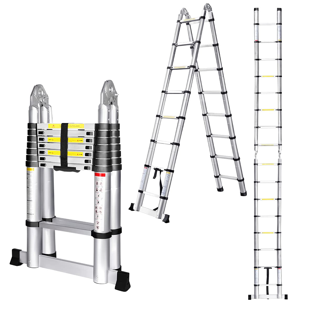 Escalera de extensión rectaAltura extensible de 16.5 pies. Extensible hasta 16.5 pies si es necesario la escalera de rv ideal para uso en interiores y exteriores. Llega a tus canalones azotea o ventanas exteriores con facilidad. | Escalera A-FrameAltura del marco A de 8.2 pies+8.2 pies Fácil de convertir la escalera en una posición de marco A lo que le permite entrar en los lugares más altos para instalar un ventilador de techo reparar o decorar su casa. | Escalera de escaleraUtilice una escalera en las escaleras de forma segura Ajusta fácilmente la altura de un lado de la escalera telescópica a la altura adecuada una solución perfecta para usar en escaleras para hacer tu trabajo. |