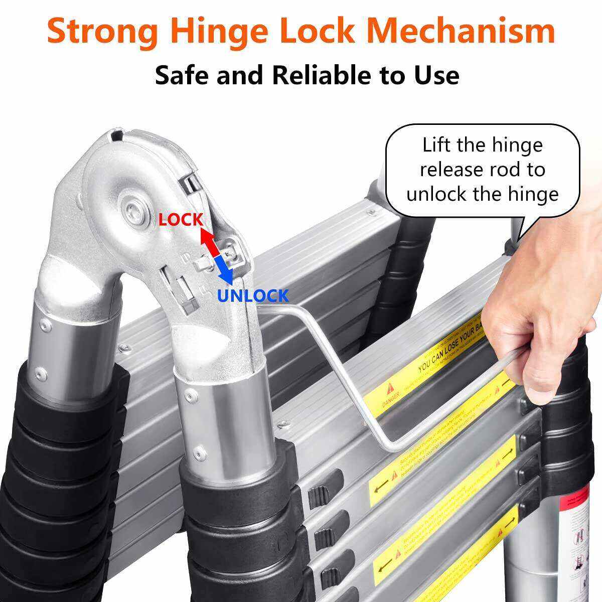 Bisagras de bloqueo de seguridadLa escalera de techo tiene una bisagra de bloqueo doble para bloquear automáticamente la escalera en su lugar segura y confiable. | Cerraduras independientesCaracterística con cerradura independiente sin sistema de cierre de pellizco para mantener sus manos o dedos seguros. | Peldaños antideslizantesDiseño con peldaños más anchos y peldaños antideslizantes (ancho: 1.8 in) garantiza una escalada segura. | Pies antideslizantes/barra estabilizadoraViene con patas angulares antideslizantes con barra estabilizadora (longitud: 26.8 pulgadas para mayor estabilidad. |