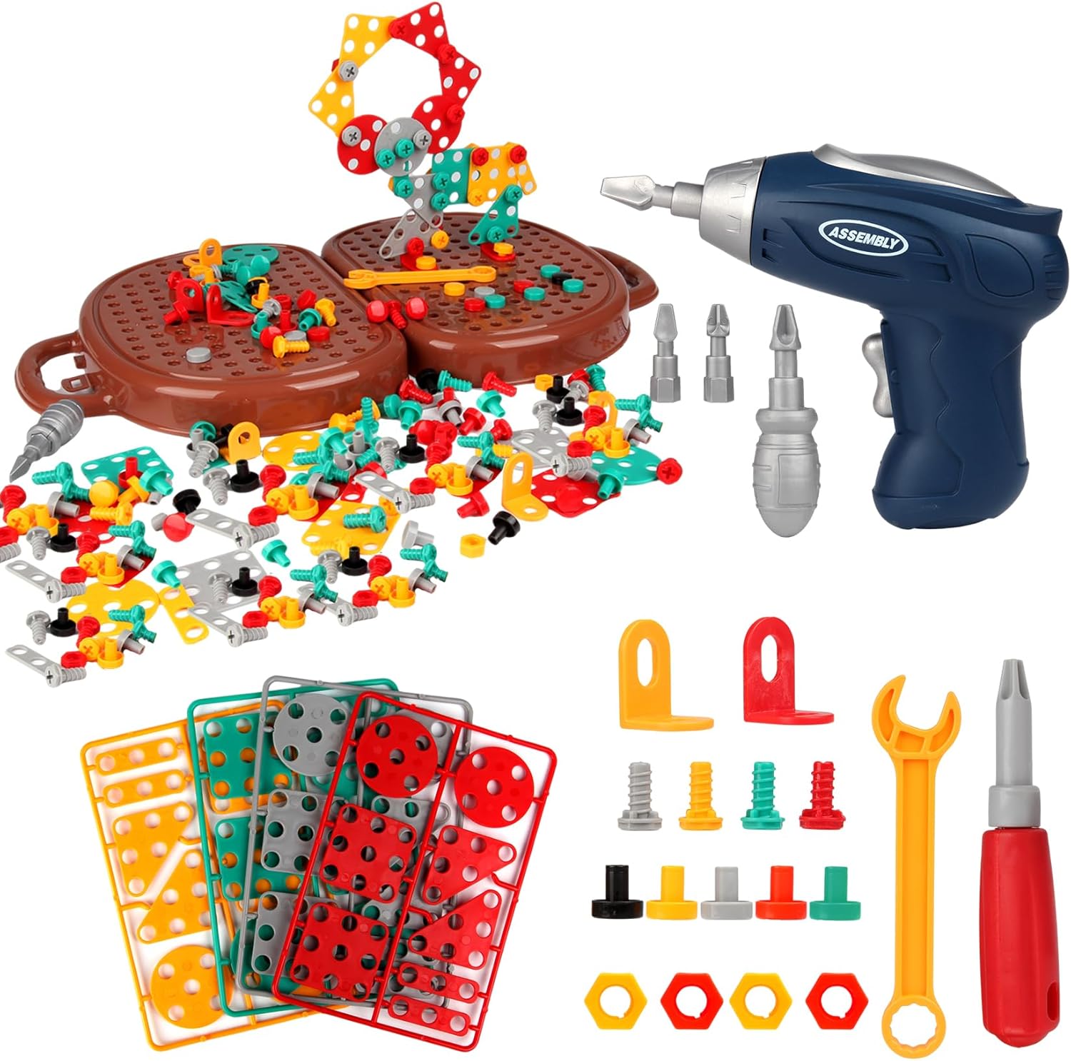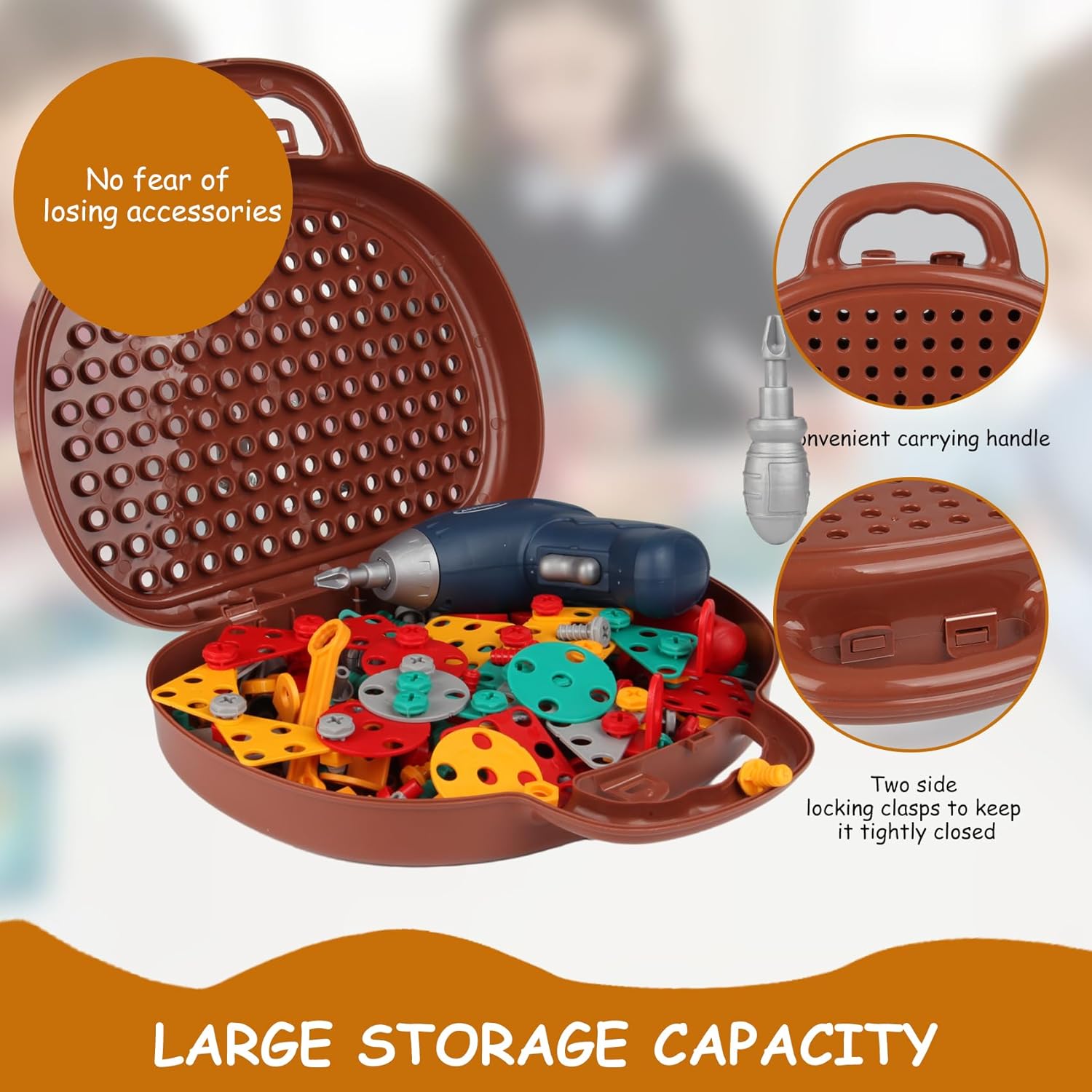 - 【Perfect Gift for Kids】: With an electric drill and screwdriver, design and build your own cute models by combining screws and nuts. Creative building builds hands-on ability. The magical Montessori play toolbox with drill is great for kids of all ages, it's the perfect gift for Christmas, Halloween, Thanksgiving and Birthdays!