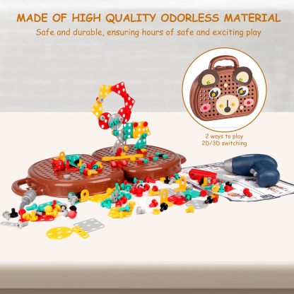 Every kid's drill and screw set maximizes their spatial awareness, logic problem solving and fine motor skills. STEM development through elementary engineering, construction play, and early mathematics instruction. Hope our products can bring you surprise and good mood.